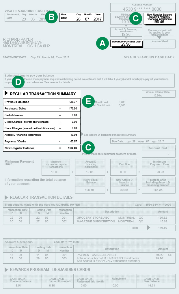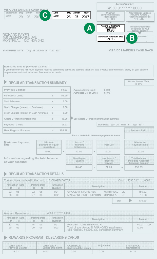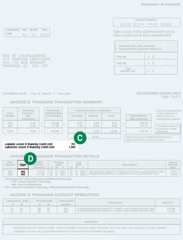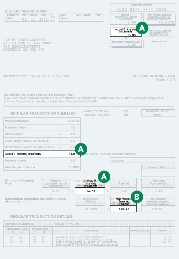 With this Accord D financing plan, you pay in equal installments. Each month, we add the installment amount to the minimum payment due on your card.