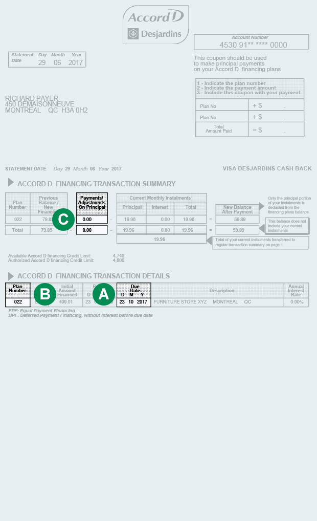 With this "buy now, pay later" Accord D financing plan, you repay the amount in full by the plan's due date. You receive a reminder on your credit card statement 30 to 59 days before your financing balance comes due.