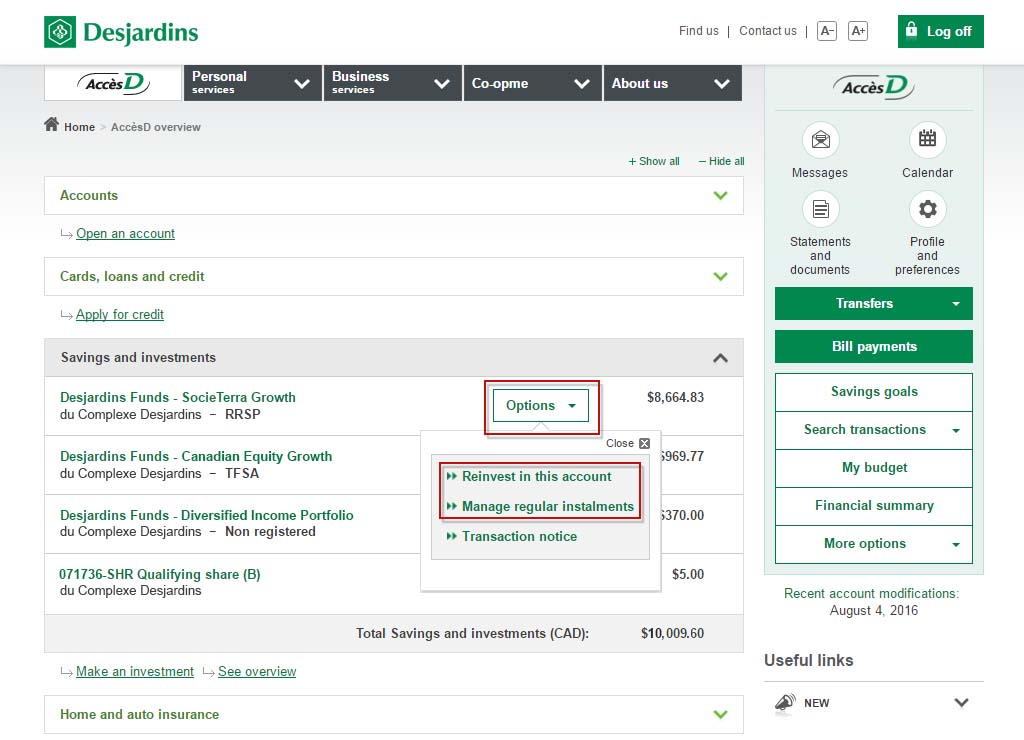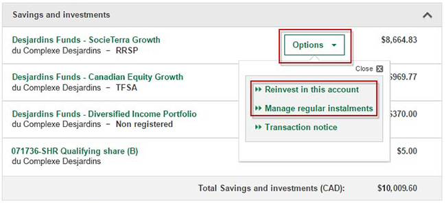 2a. If you already own this investment: on the overview page, click on "Options", then "Reinvest in this account" or "Manage regular instalments"