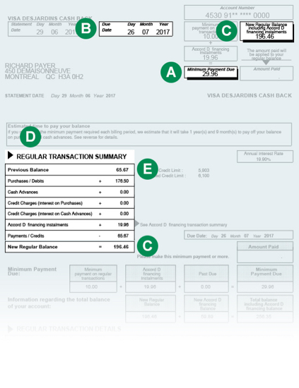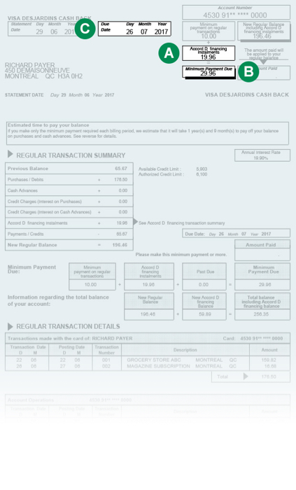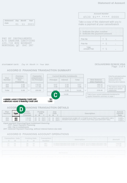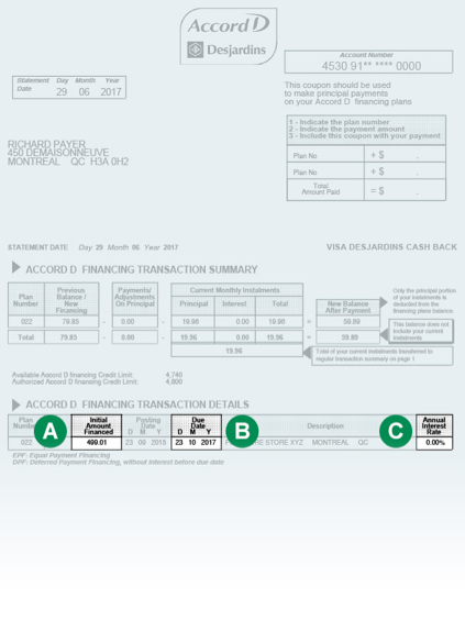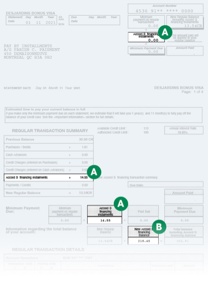 With this Accord D financing plan, you pay in equal installments. Each month, we add the installment amount to the minimum payment due on your card.