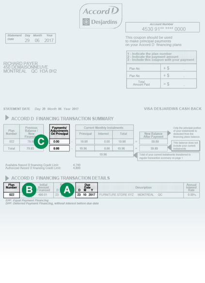 With this "buy now, pay later" Accord D financing plan, you repay the amount in full by the plan's due date. You receive a reminder on your credit card statement 30 to 59 days before your financing balance comes due.