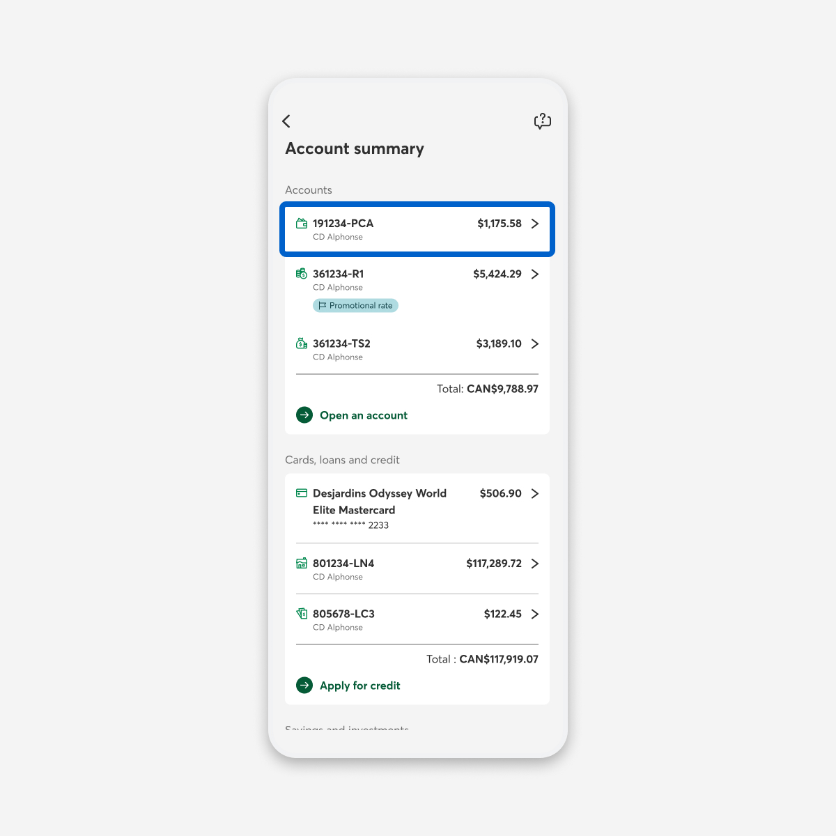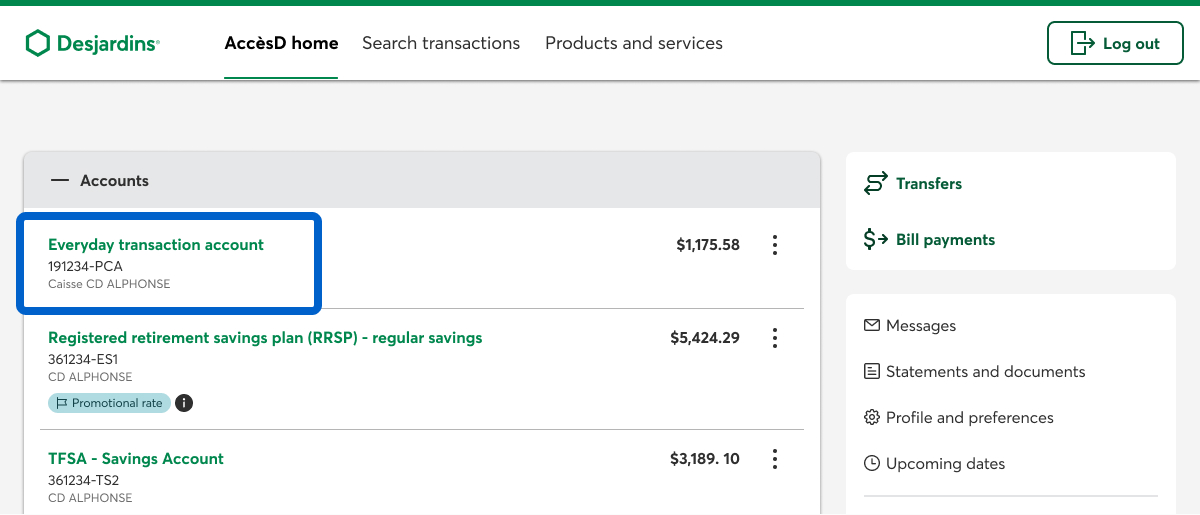 On the AccèsD home page, select the everyday account you want a void cheque for.