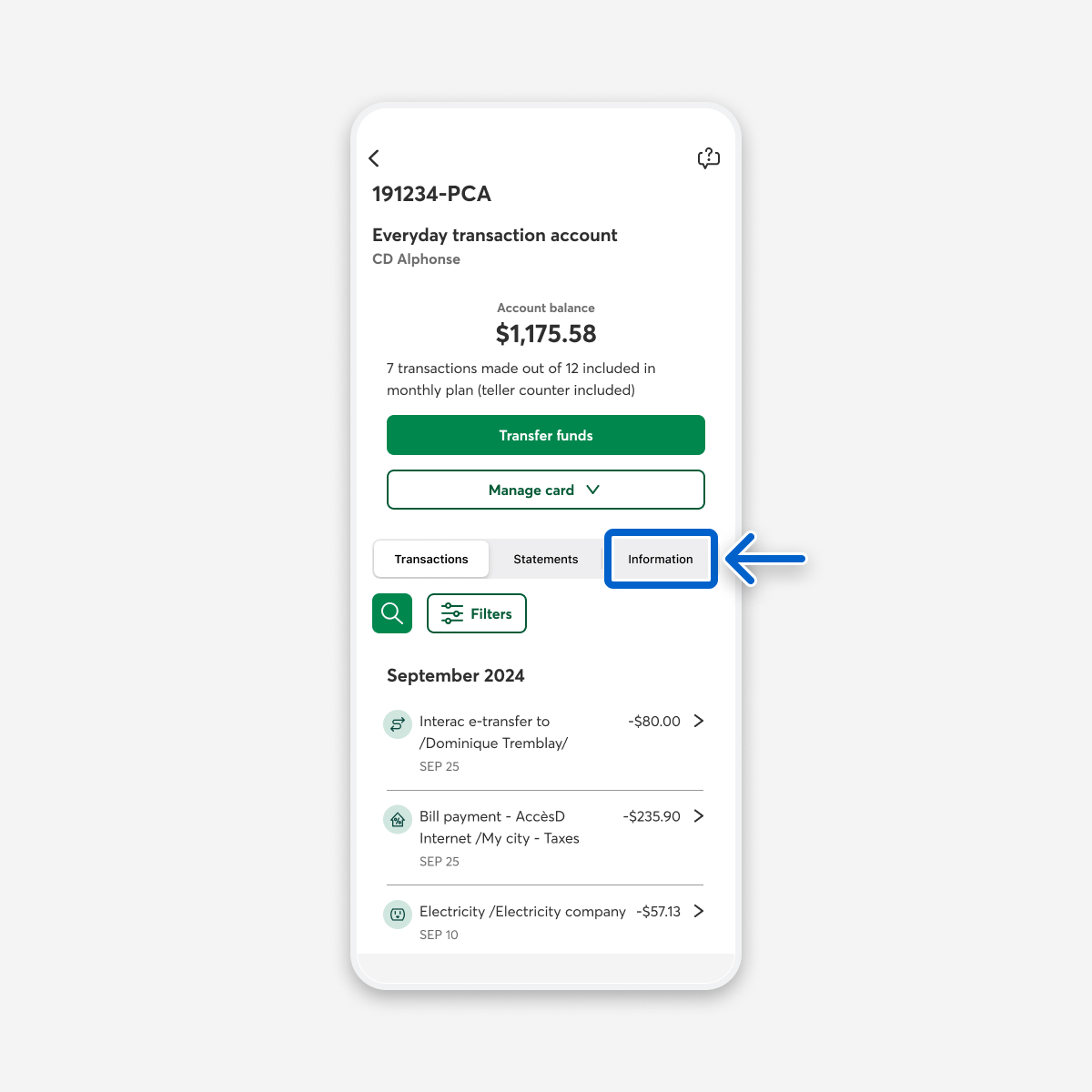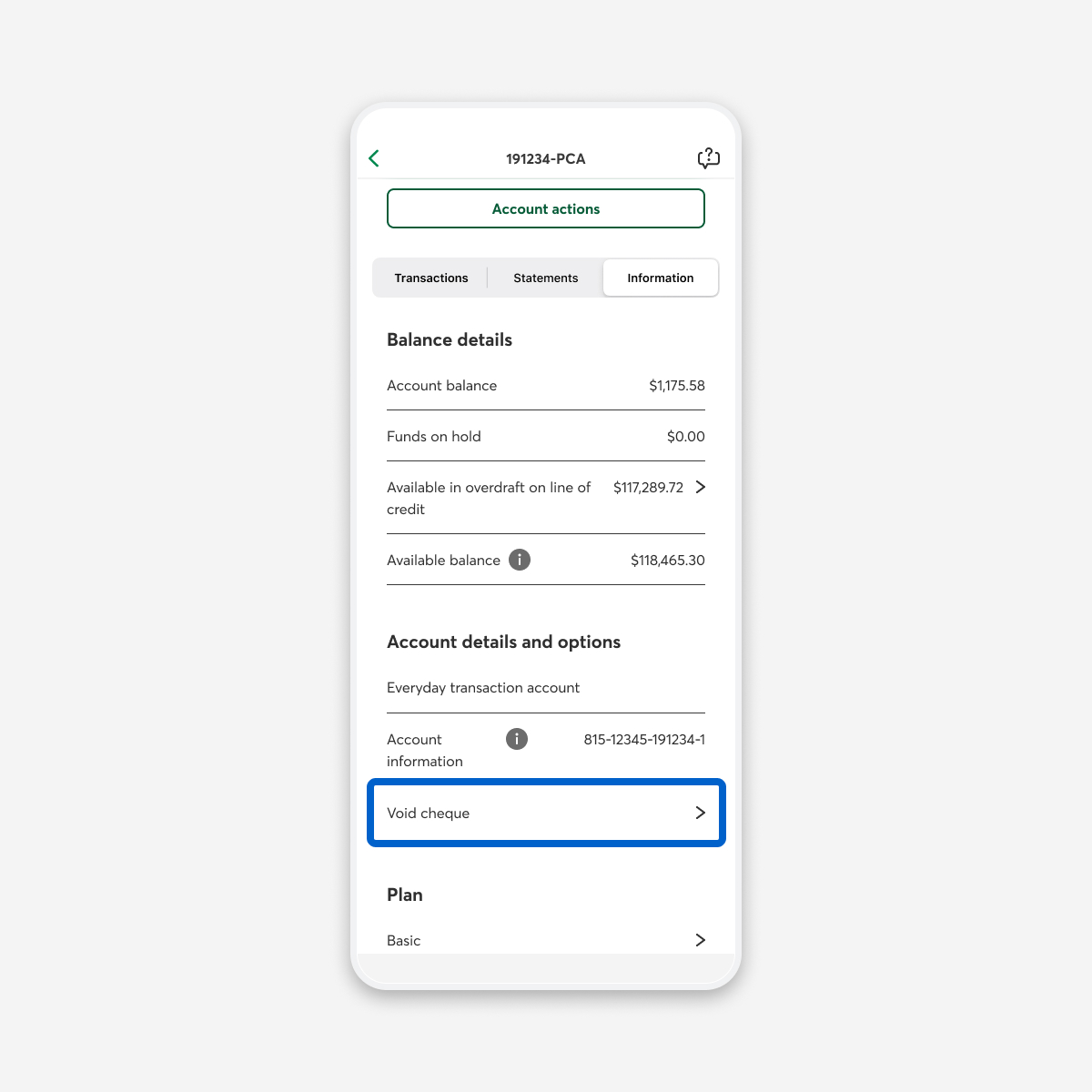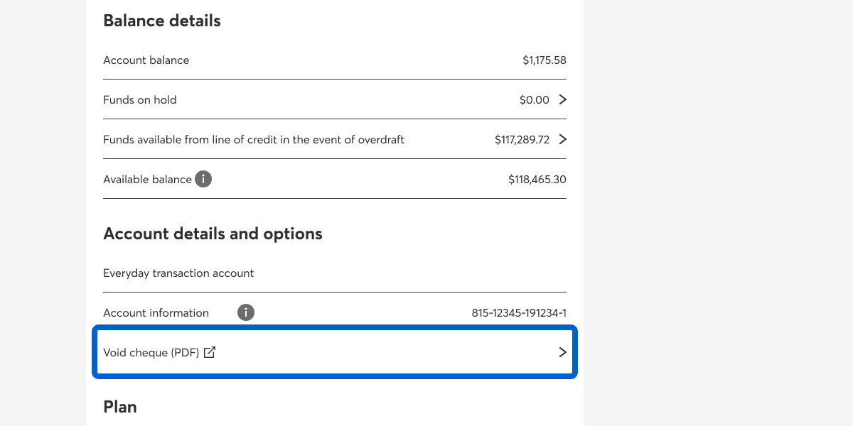 In the Account details and options section, select the Void cheque button to get a PDF of your void cheque.