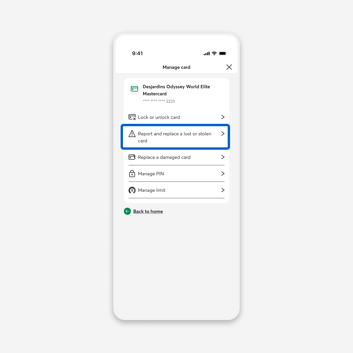 On the Manage card page, select the Report and replace a lost or stolen card link.