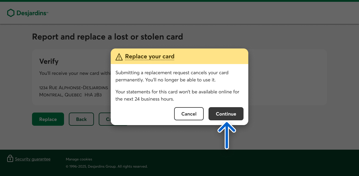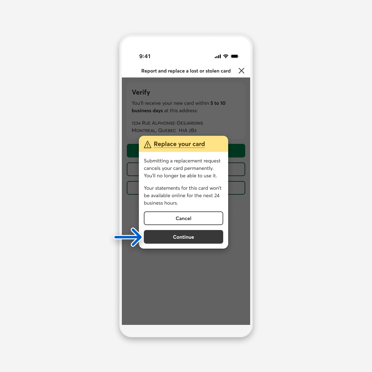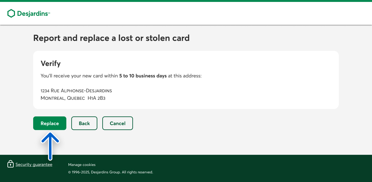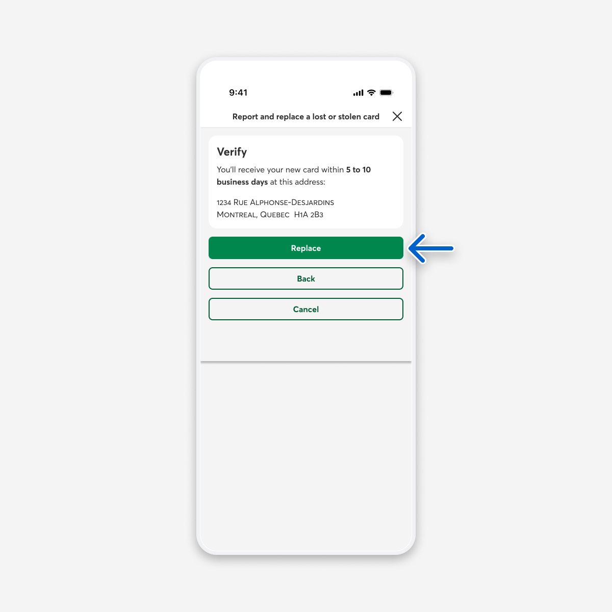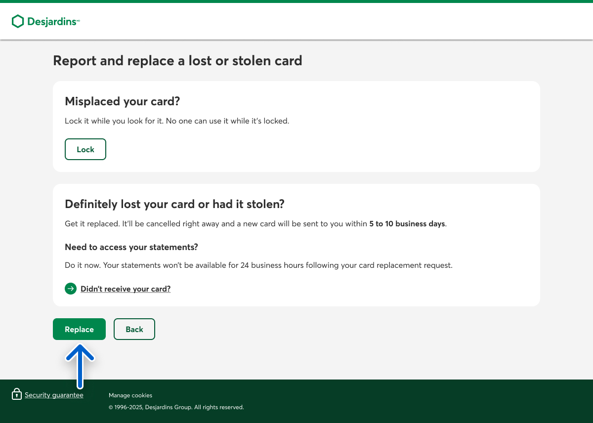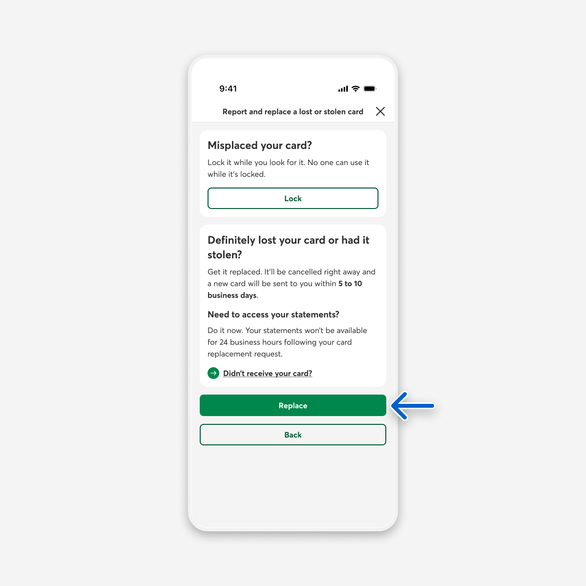 On the Report and replace a lost or stolen card page, select the Replace button.
