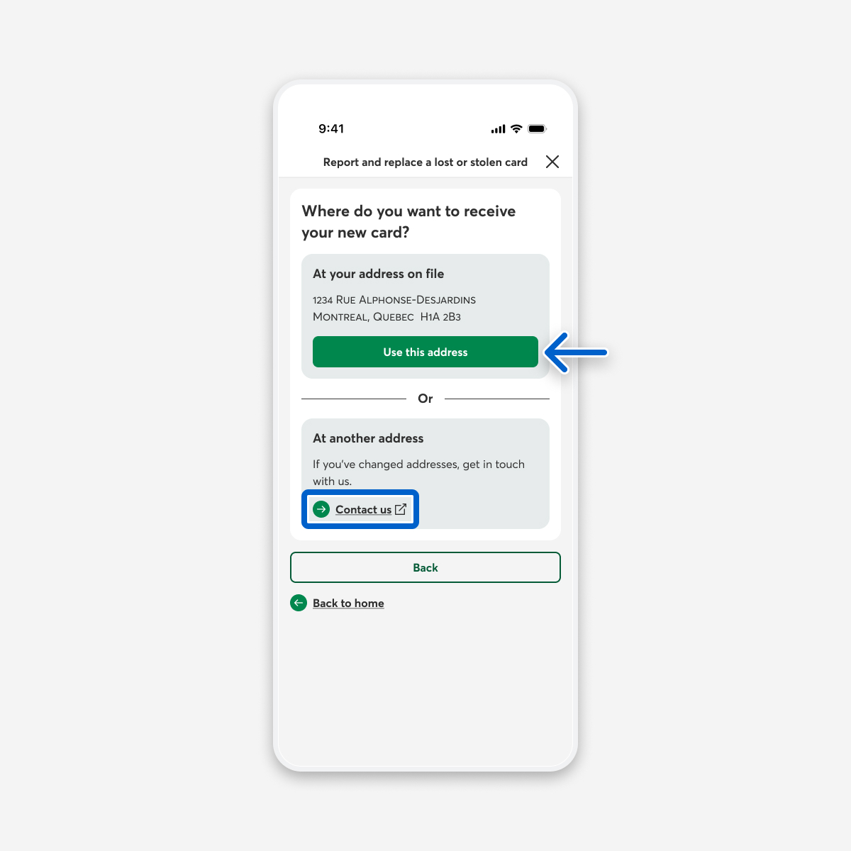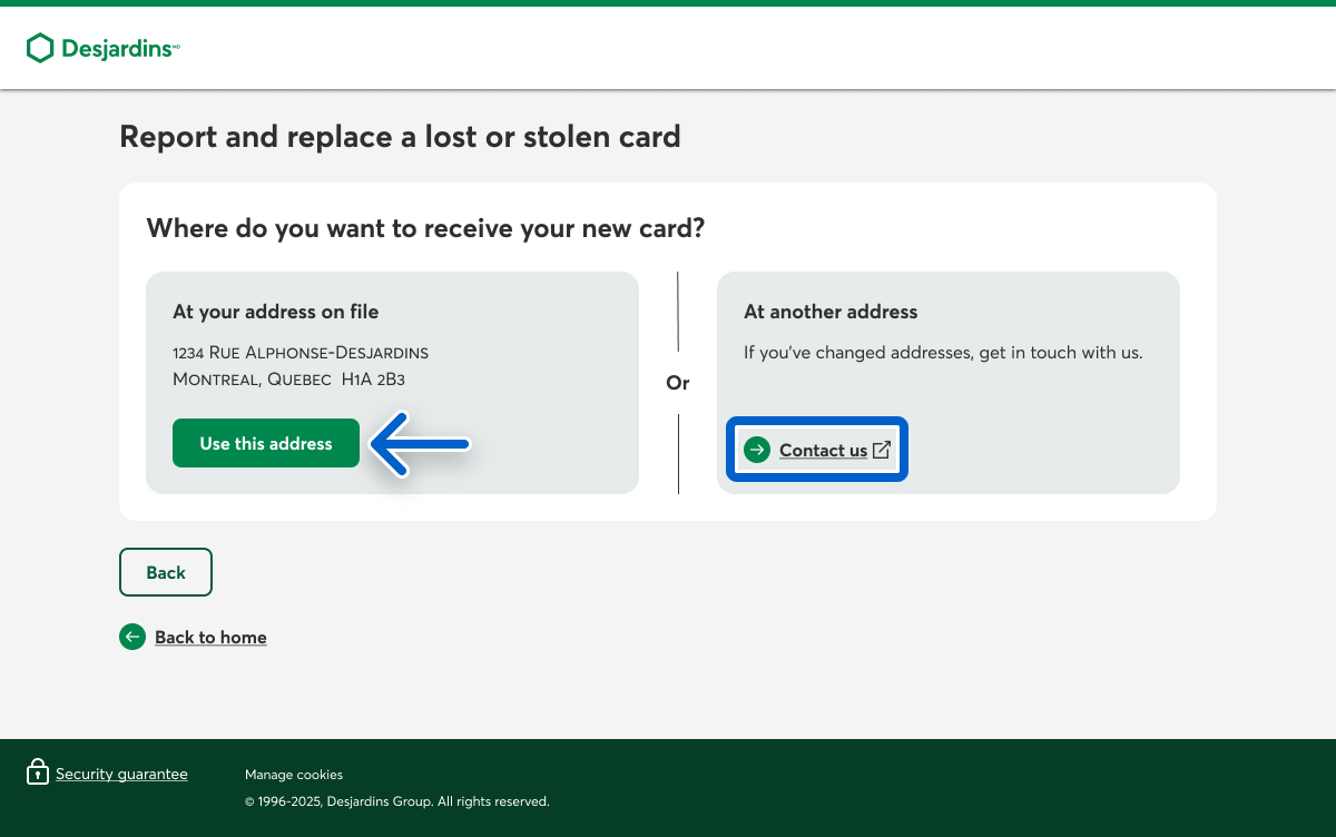 To receive your new credit card at the address on file, select the Use this address button. If you have a new address, select the Contact us link to have us update your file.