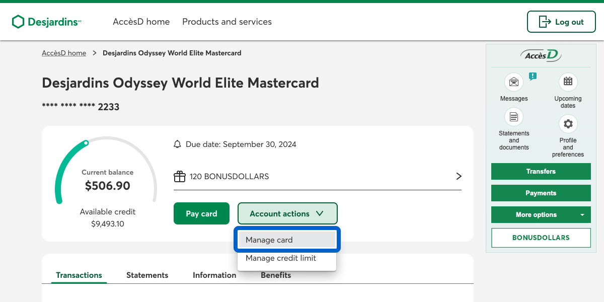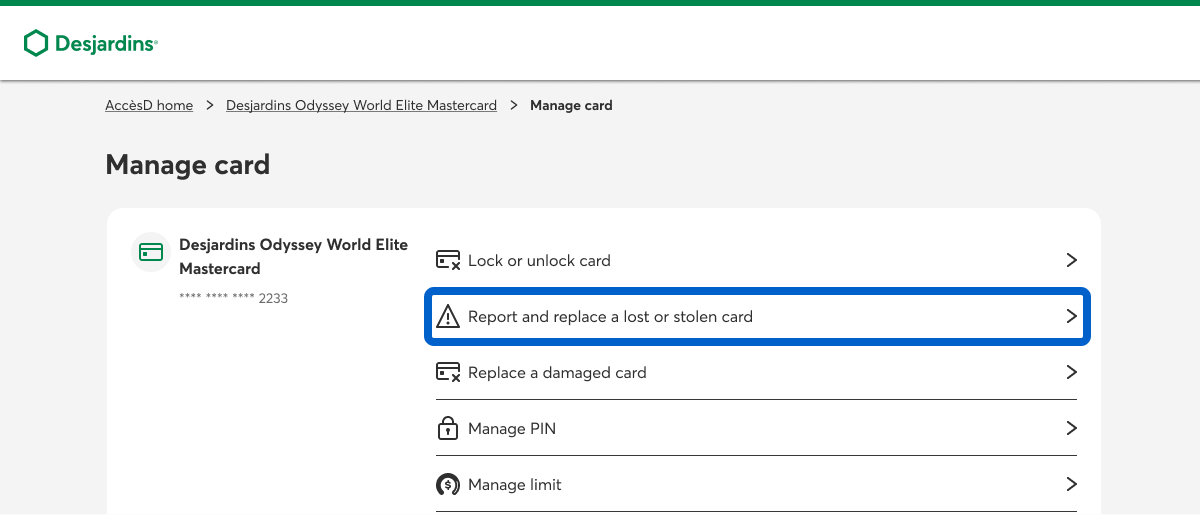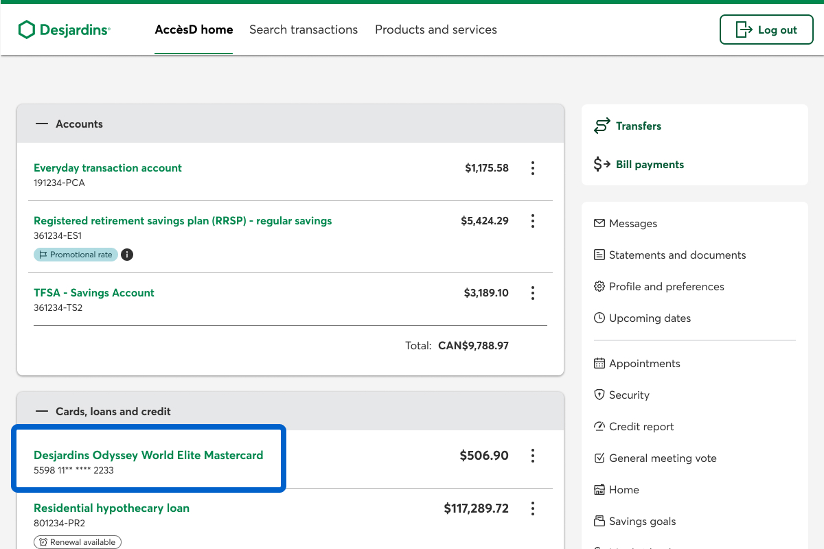 On the AccèsD home page, under Cards, loans and credit, select the credit card you want to replace.