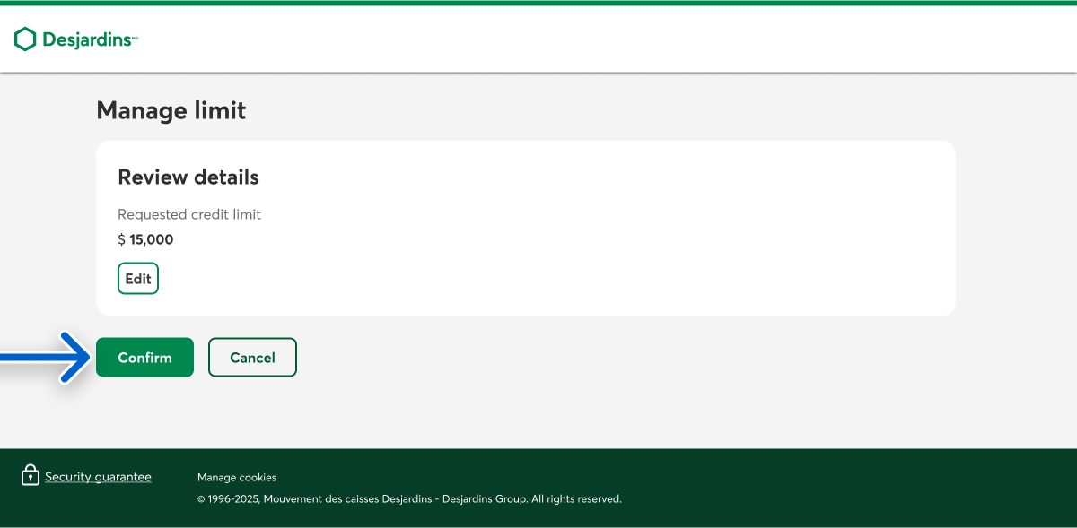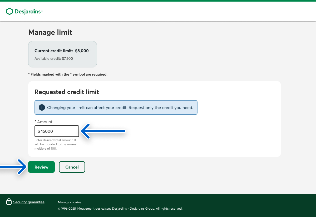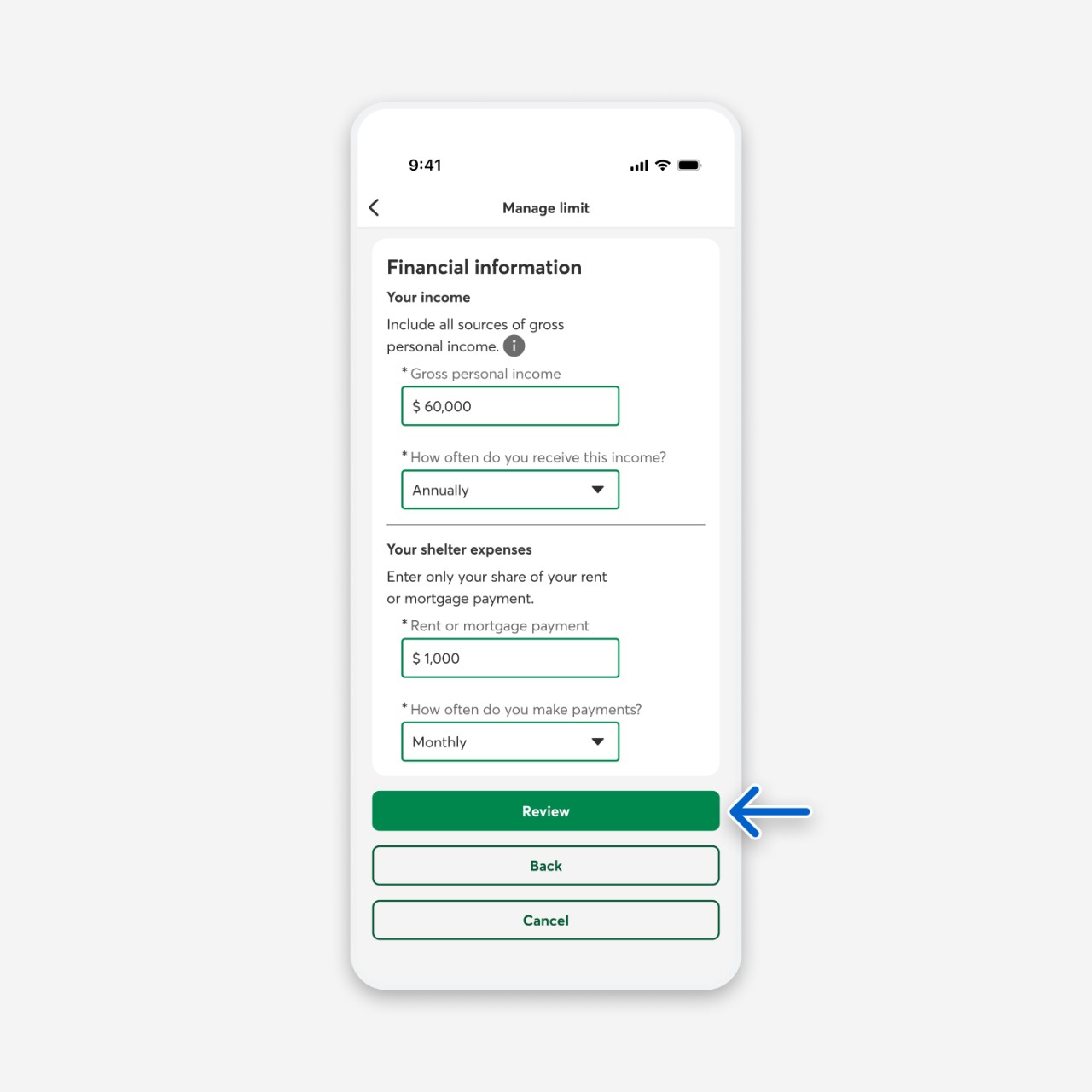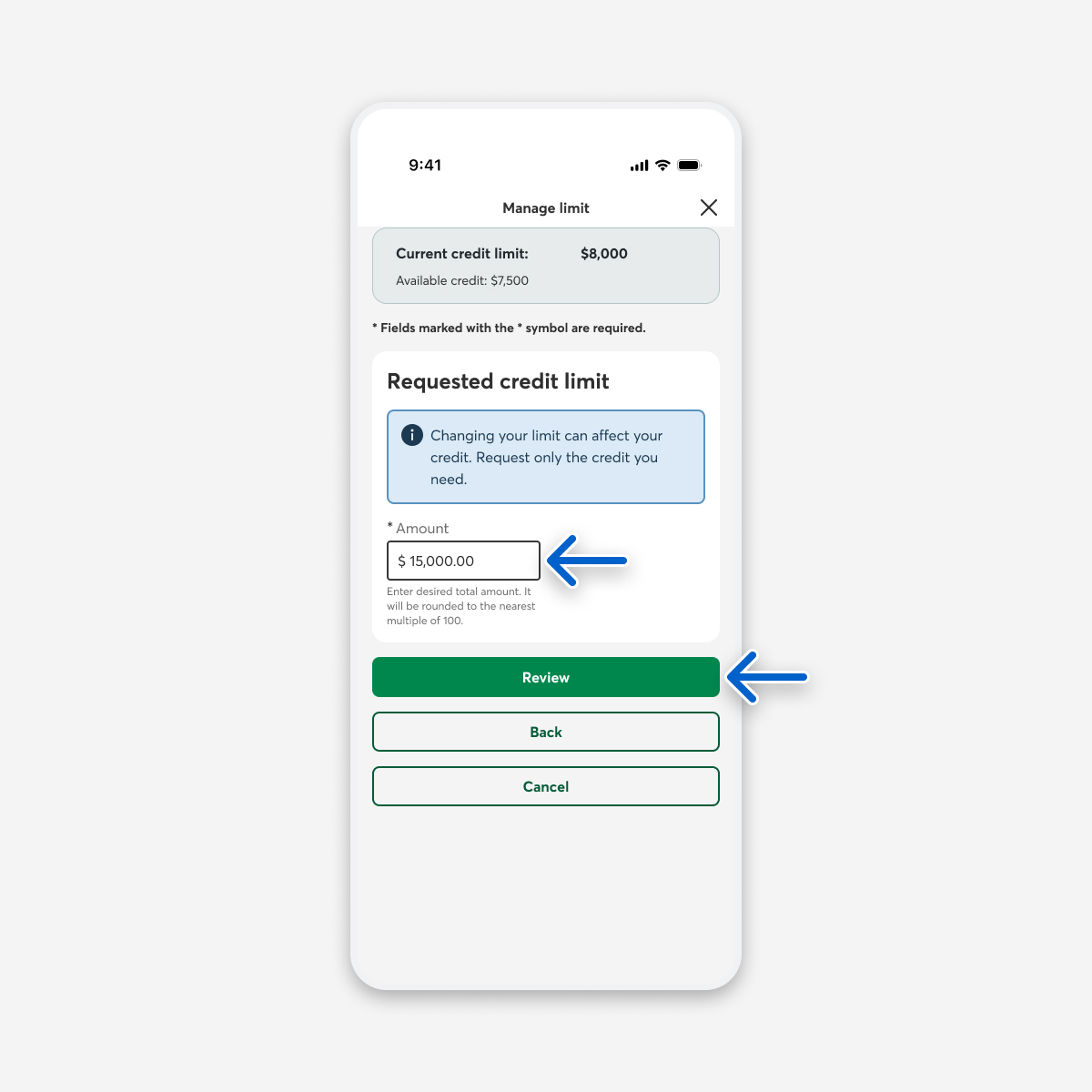 On the Manage limit – Amount page, enter the new limit you want and select the Review button.