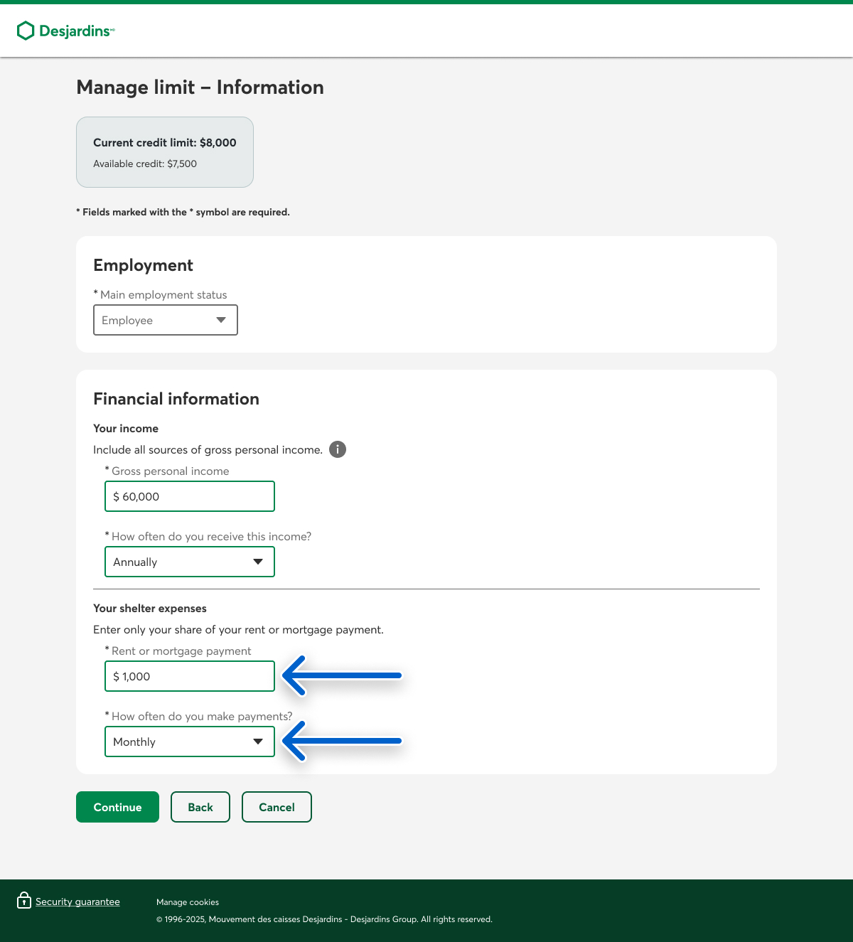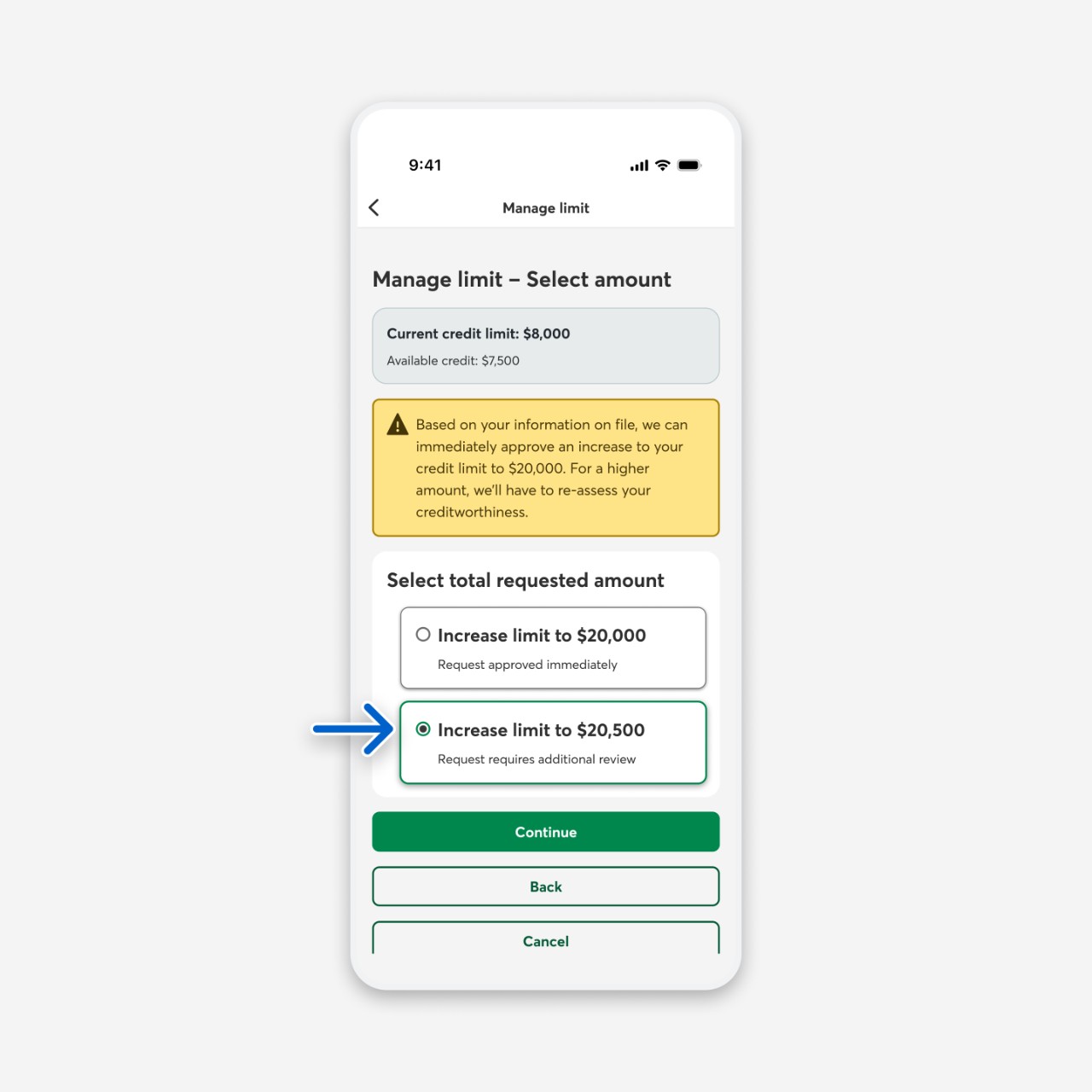 On the Manage limit – Select amount page, if you’ve been approved for a higher limit, the Select total requested amount section appears. You can select the proposed limit that we’ve already approved, or a higher limit that will require further review.