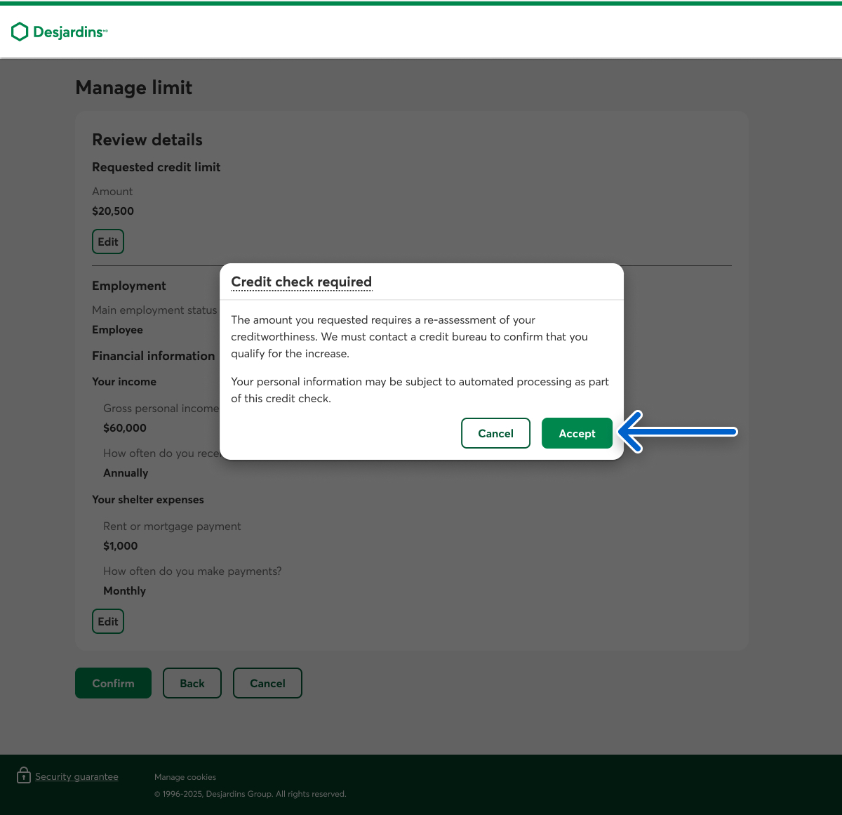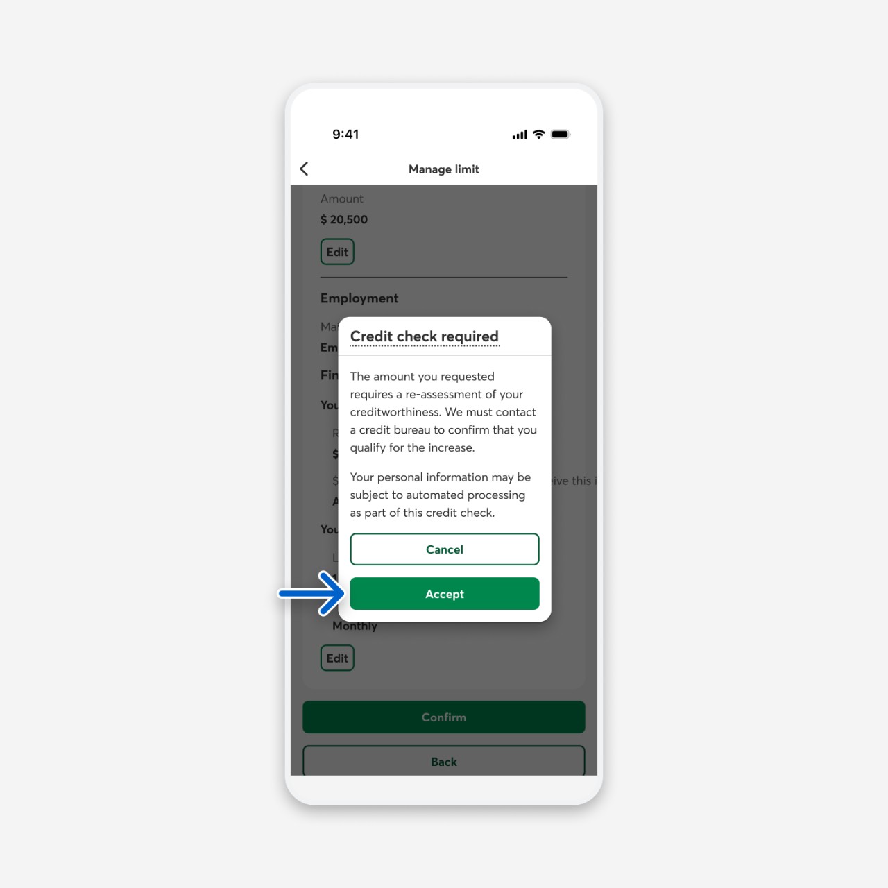 If your request requires a re-assessment, select the Accept button to authorize us to contact a credit bureau.
