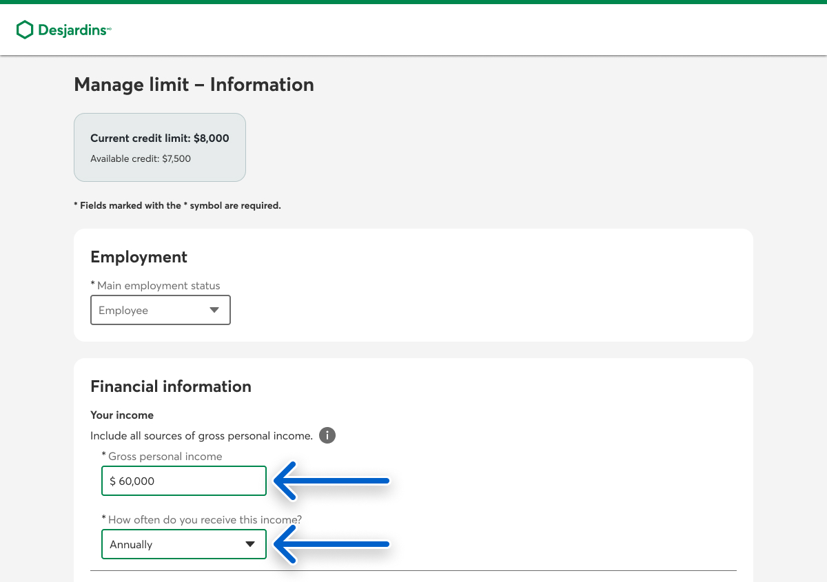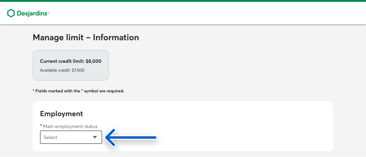 On the Manage limit – Information page, under Employment, select your main employment status from the dropdown list.