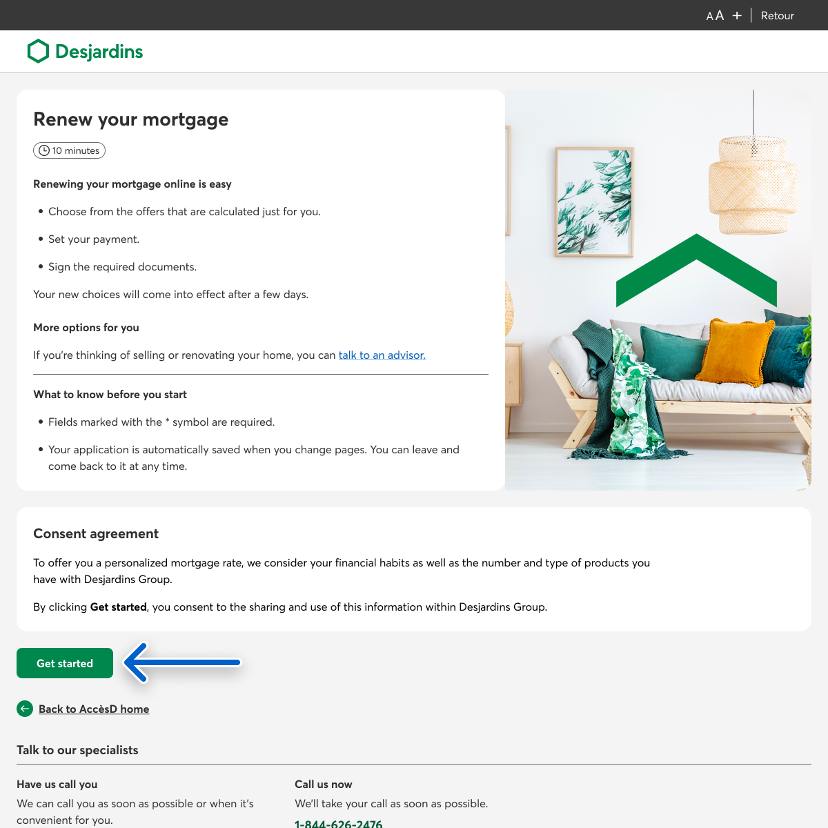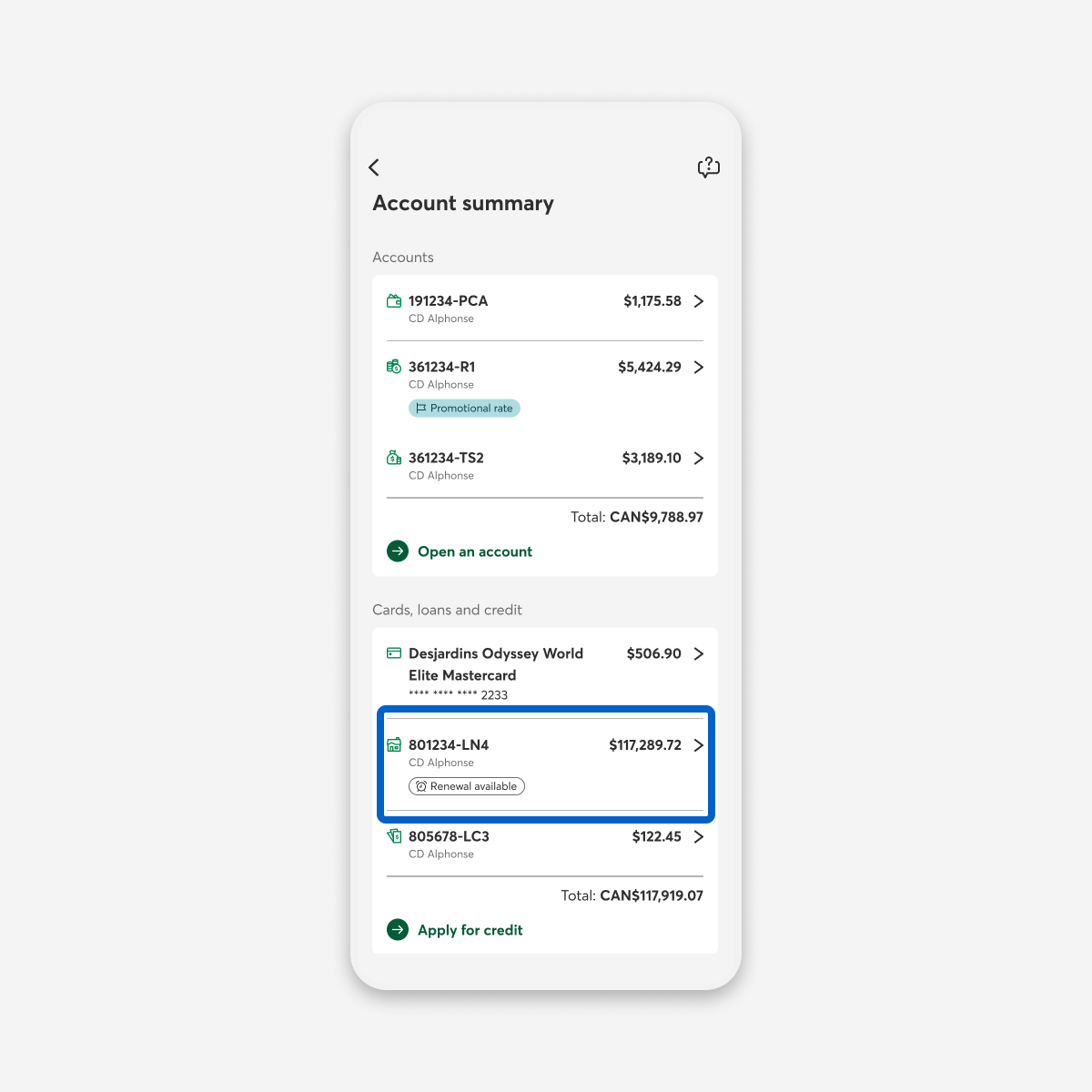 On the AccèsD home page, under Cards, loans and credit, select the mortgage that’s up for renewal.