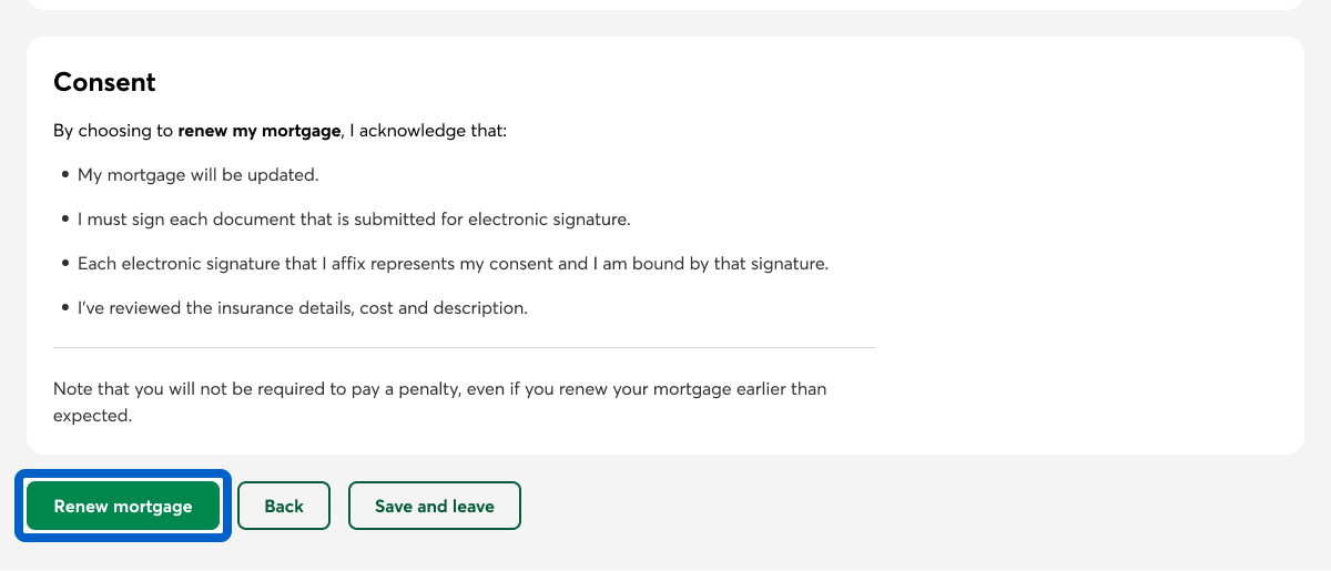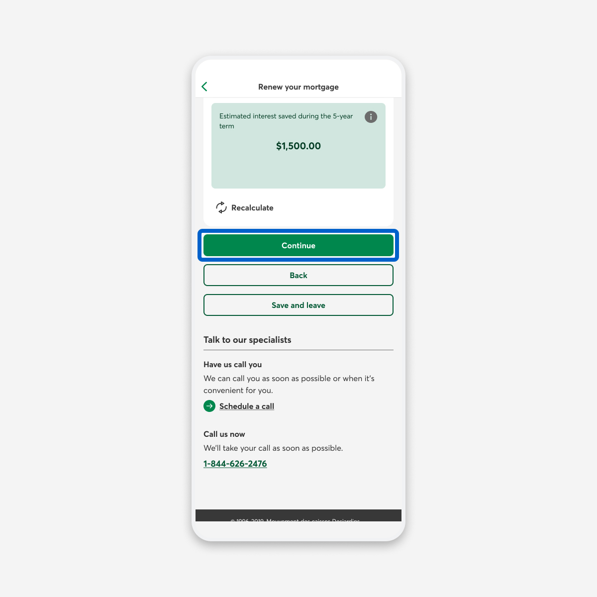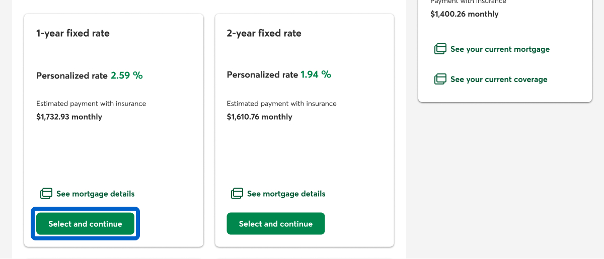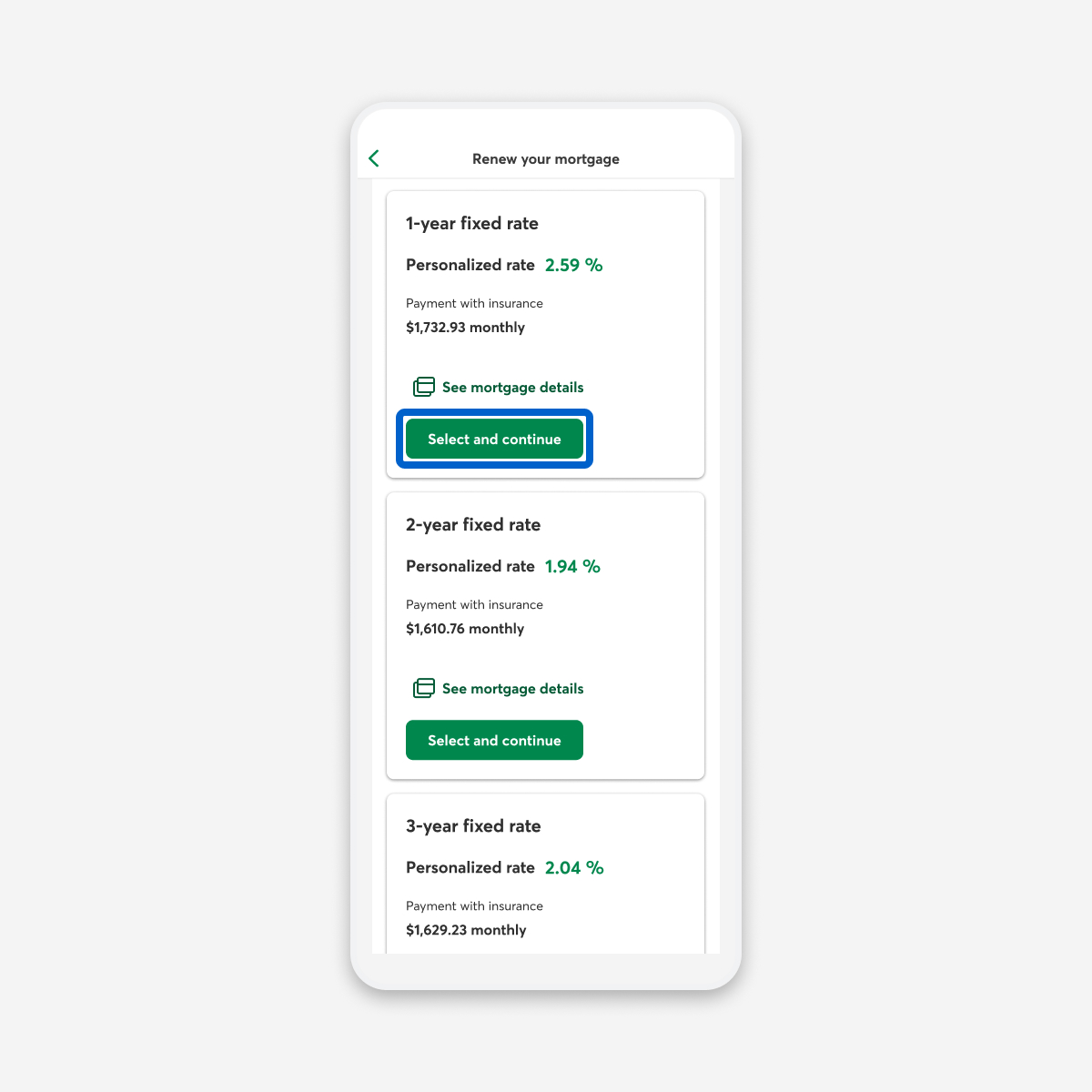 On the Mortgage renewal – Rates page, in the Choose your personalized rate step, find the rate option you want then choose the Select and continue button.