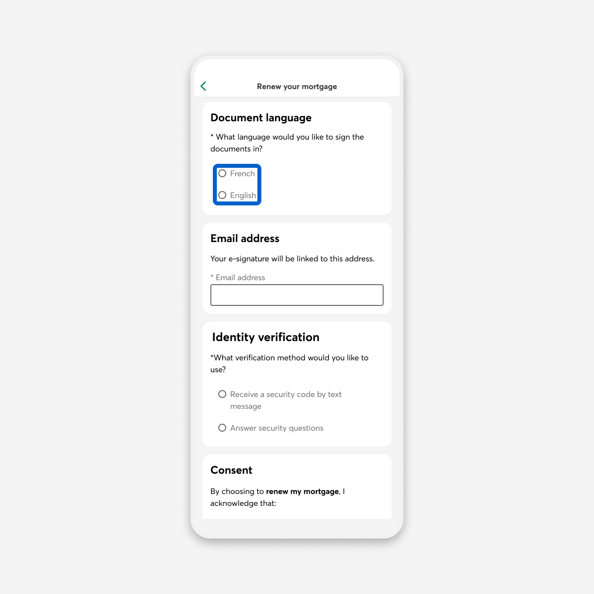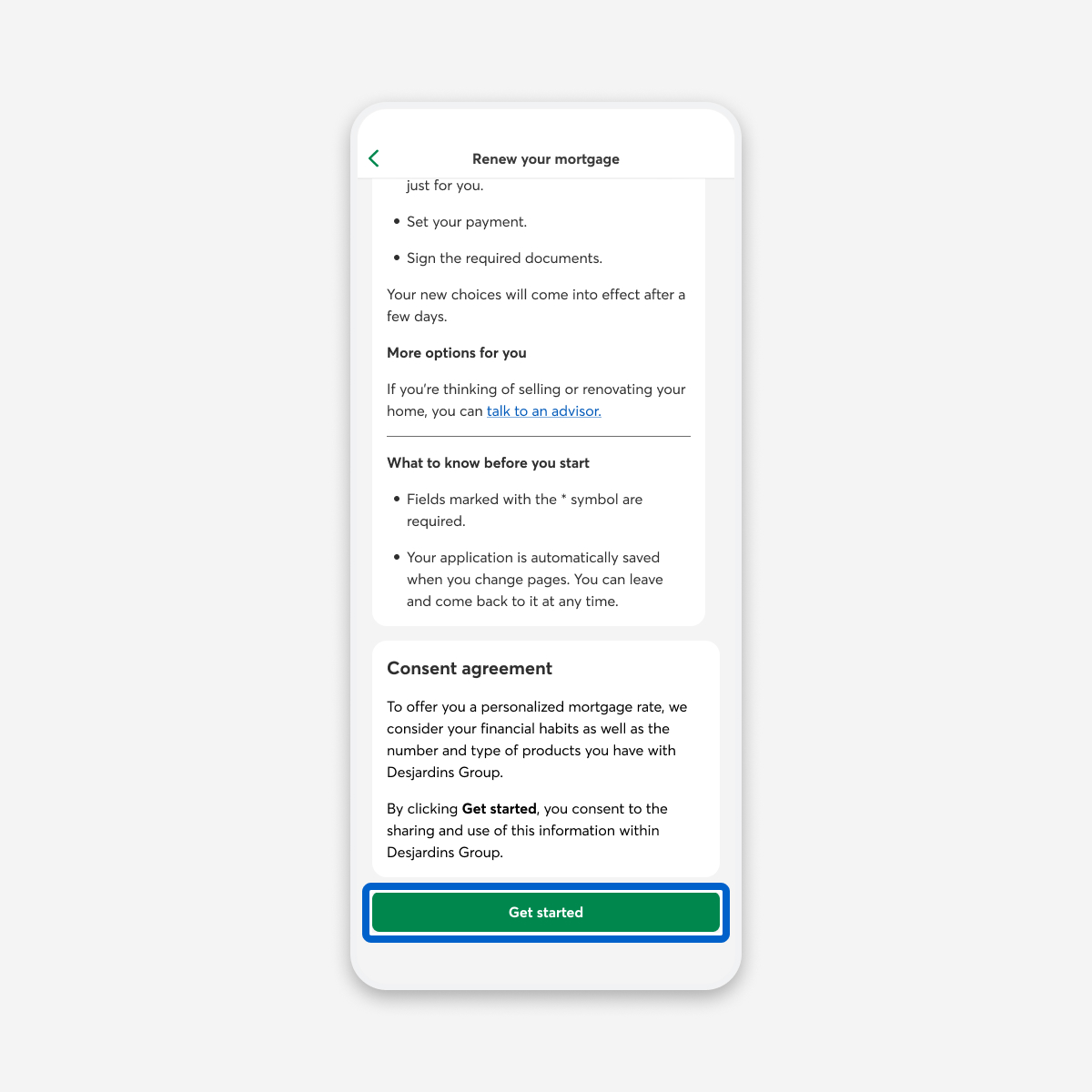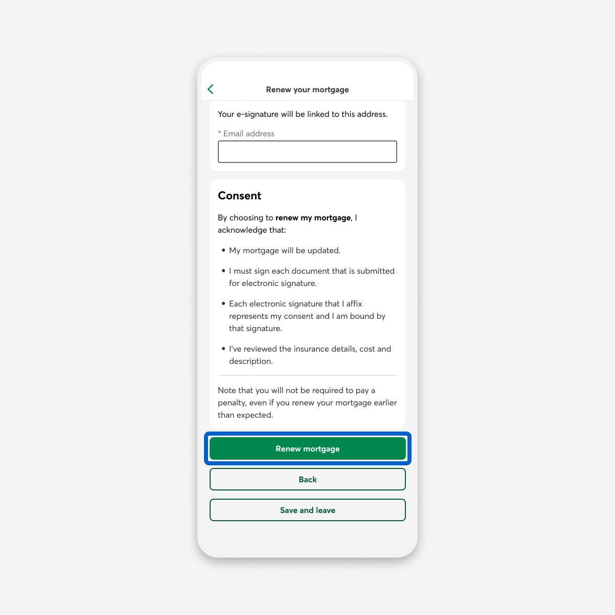 On the Mortgage renewal – Rates page, in the Choose your personalized rate step, find the rate option you want then choose the Select and continue button.