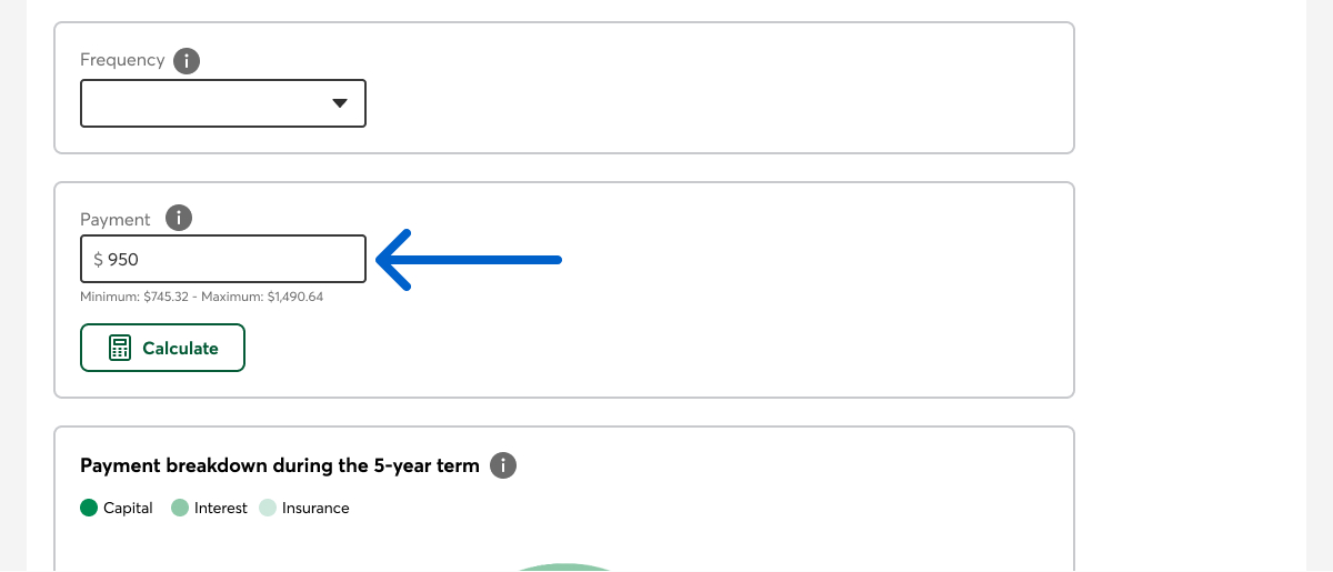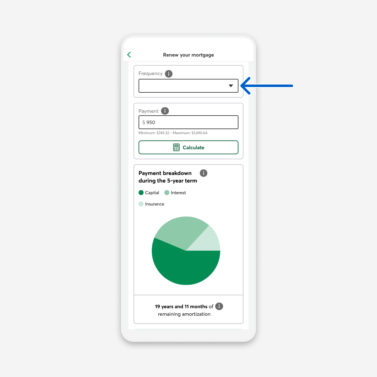 If you want to change your current payment frequency, in the Choose your payment amount step, go to Frequency and select an option from the dropdown list.
