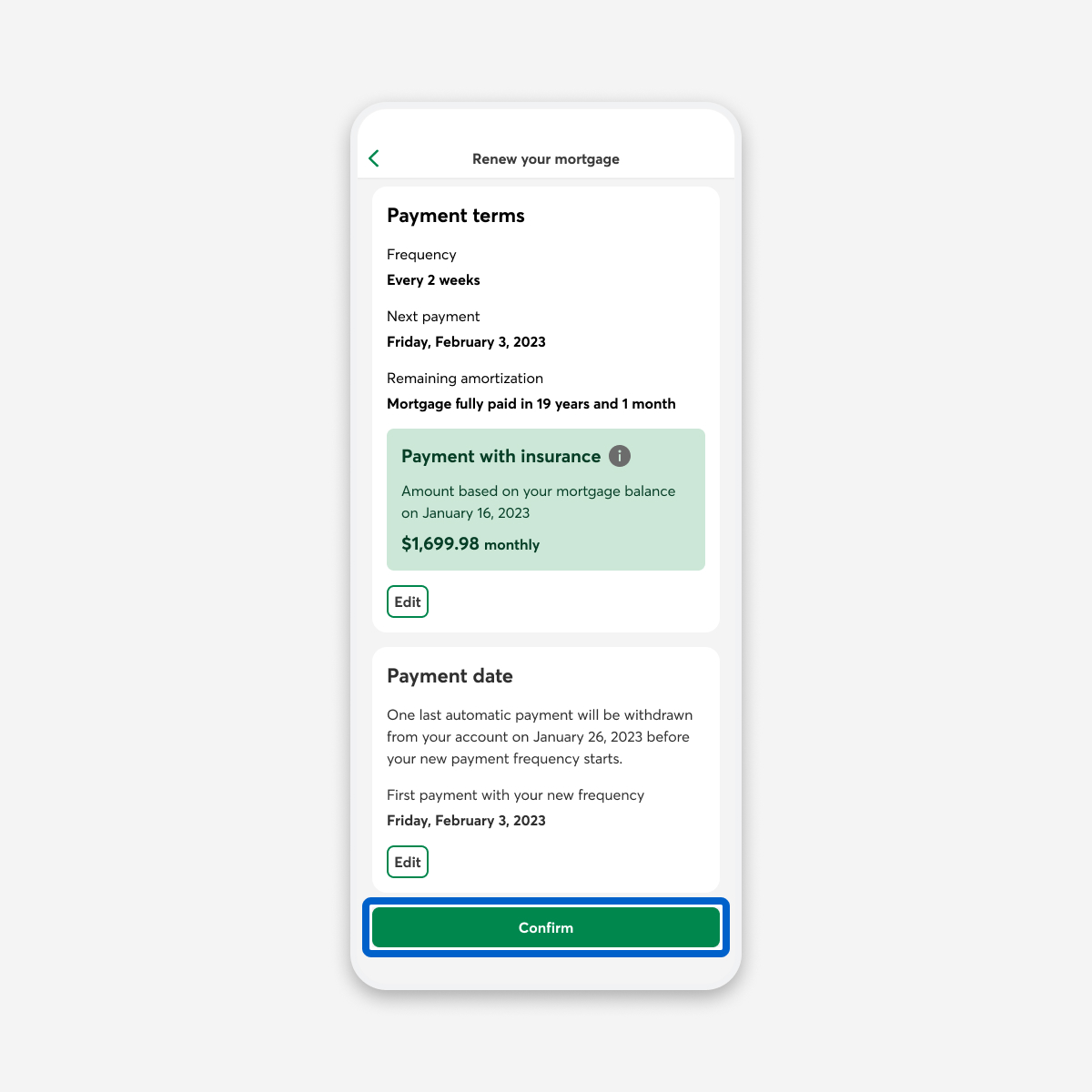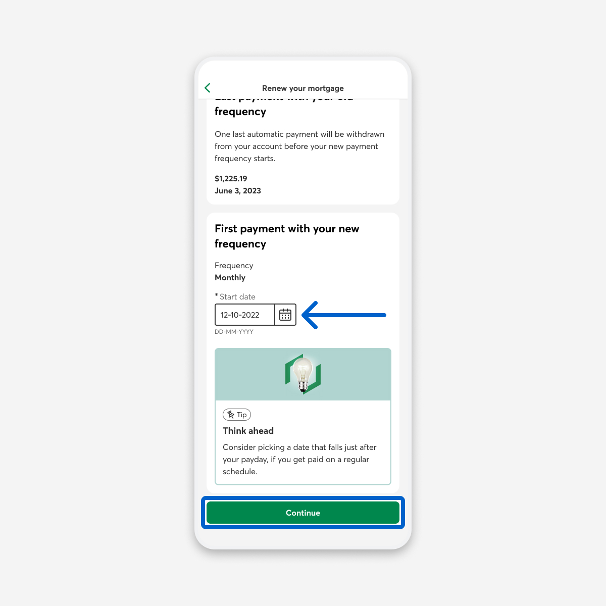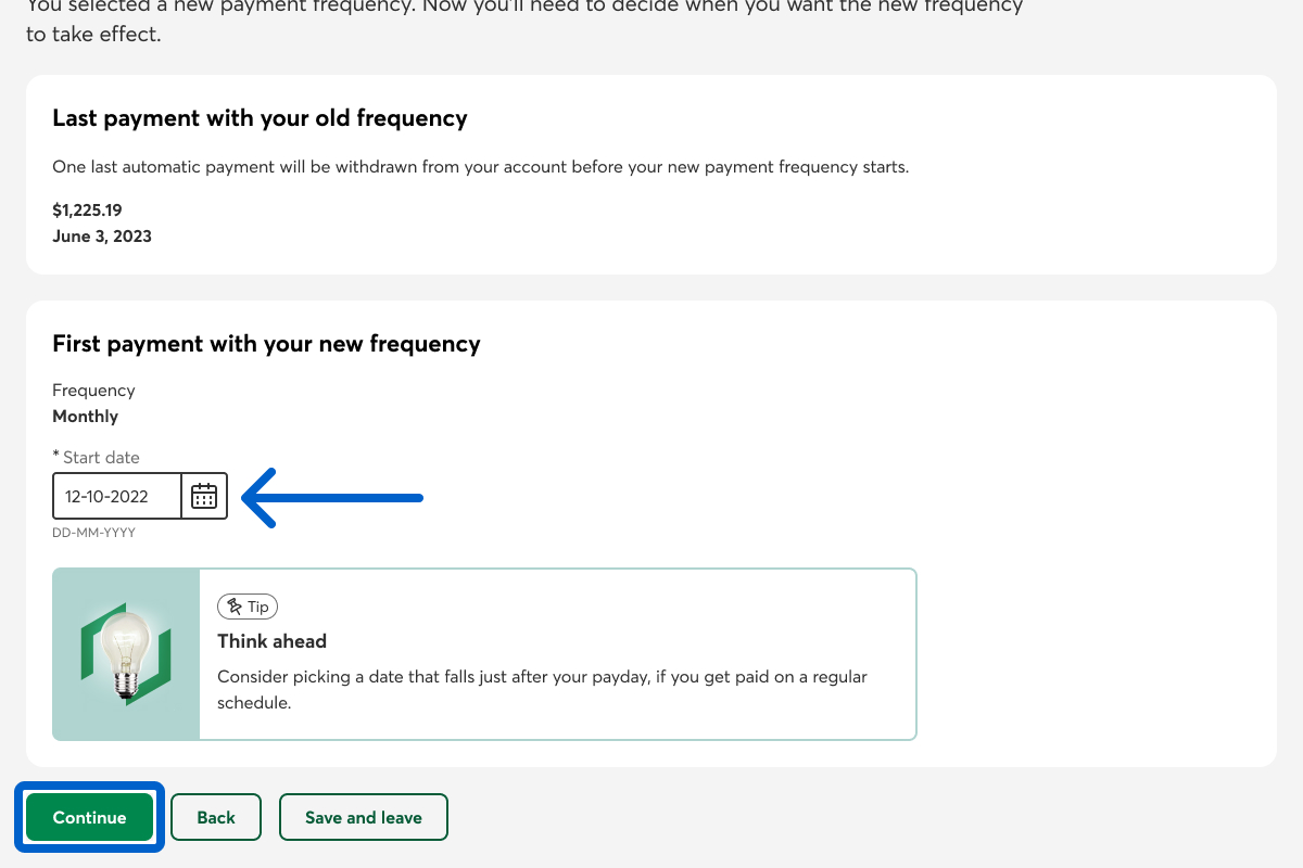 If you chose a new payment frequency, select the start date of the first payment, then select the Continue button.