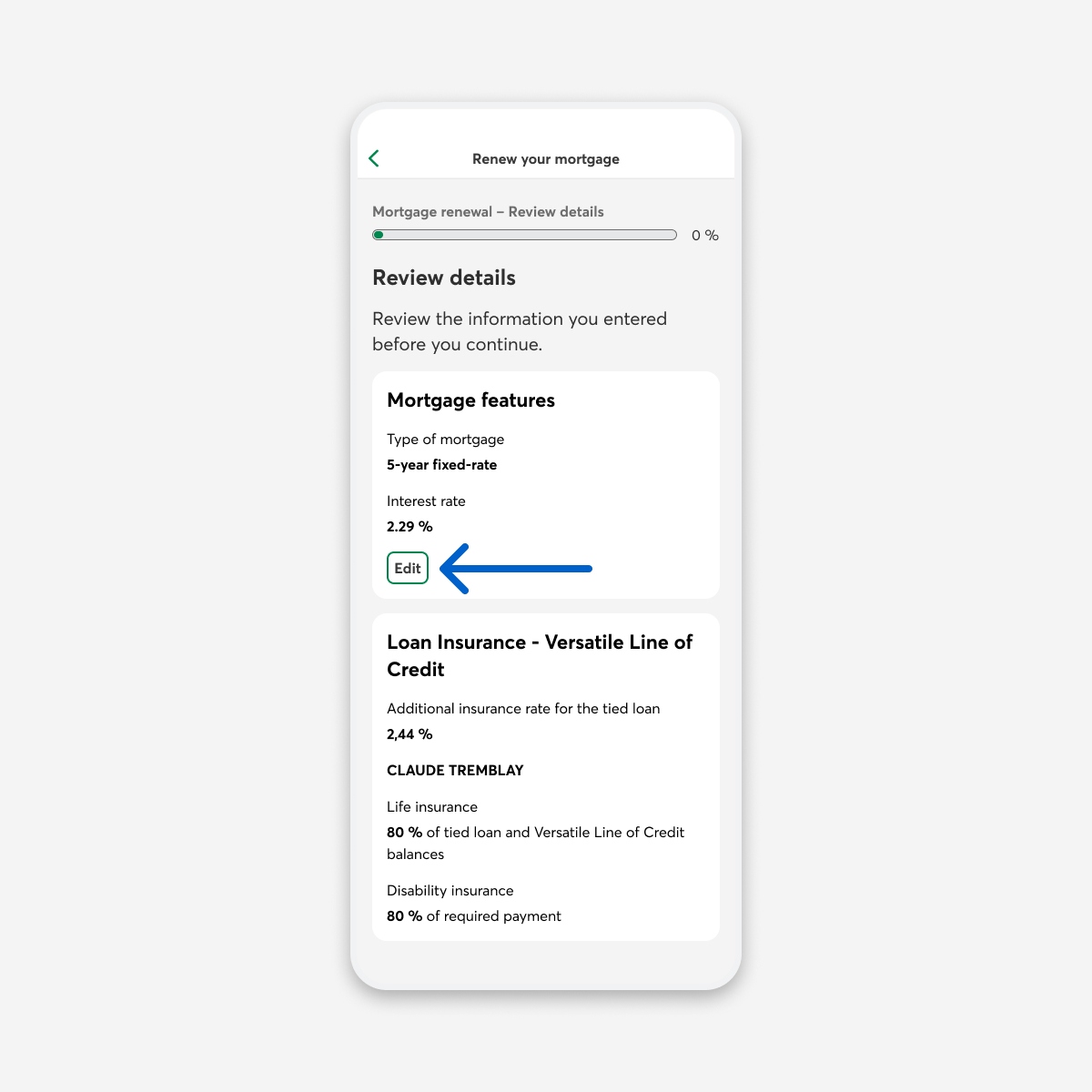 In the Review details step, make sure all the information is accurate. To change something, select the Edit button. If your co-borrower selected the rate and payment options, make sure they are correct. You can change them by selecting the Change renewal details button.