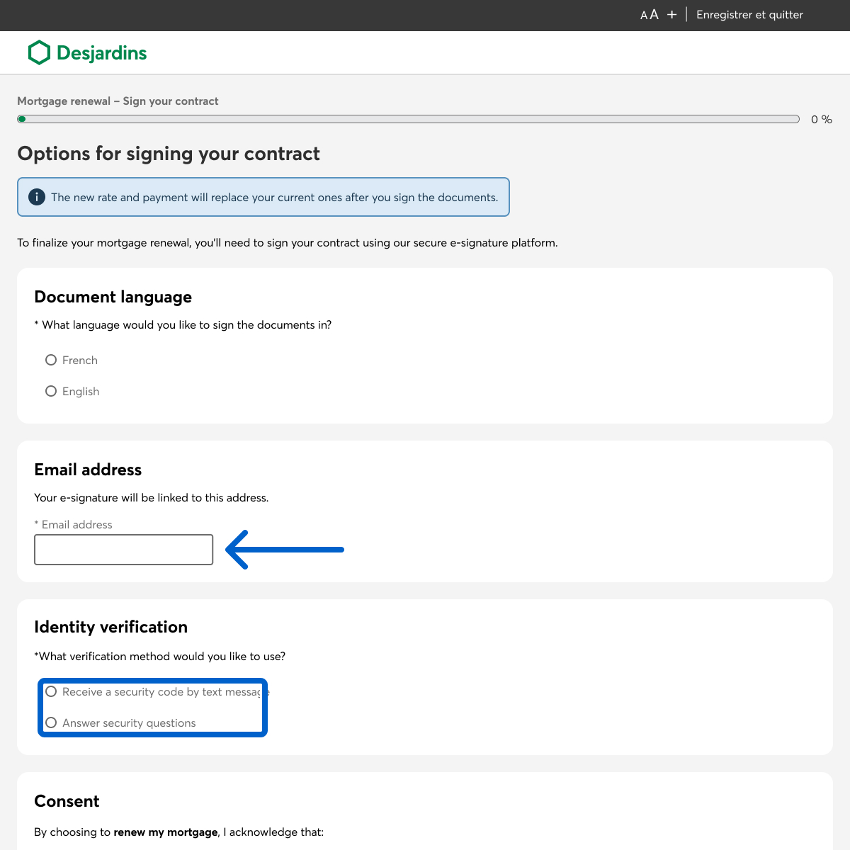 In the Sign the required documents step, read your mortgage renewal contract through to the Signatories section. Select the Next button to skip to where you need to sign.