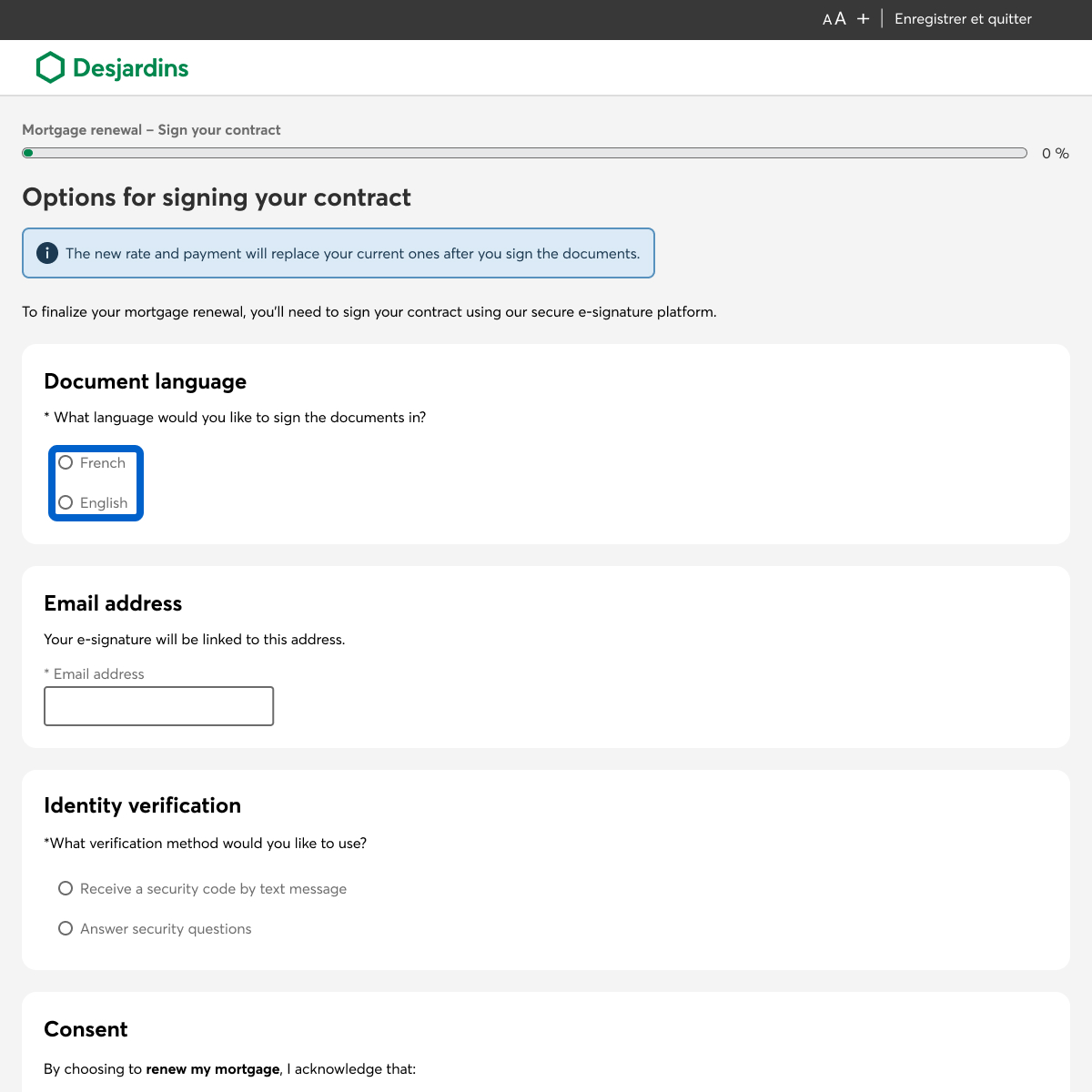 In the Options for signing your contract step, choose the language you want to sign your contract in by selecting the French or English button.
