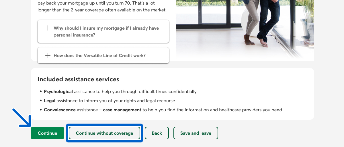 Choose the Continue button if you want to take out loan insurance, or choose the Continue without coverage button. If you’re taking out loan insurance, follow the instructions for getting loan insurance before the next step, which is choosing your mortgage payment options.