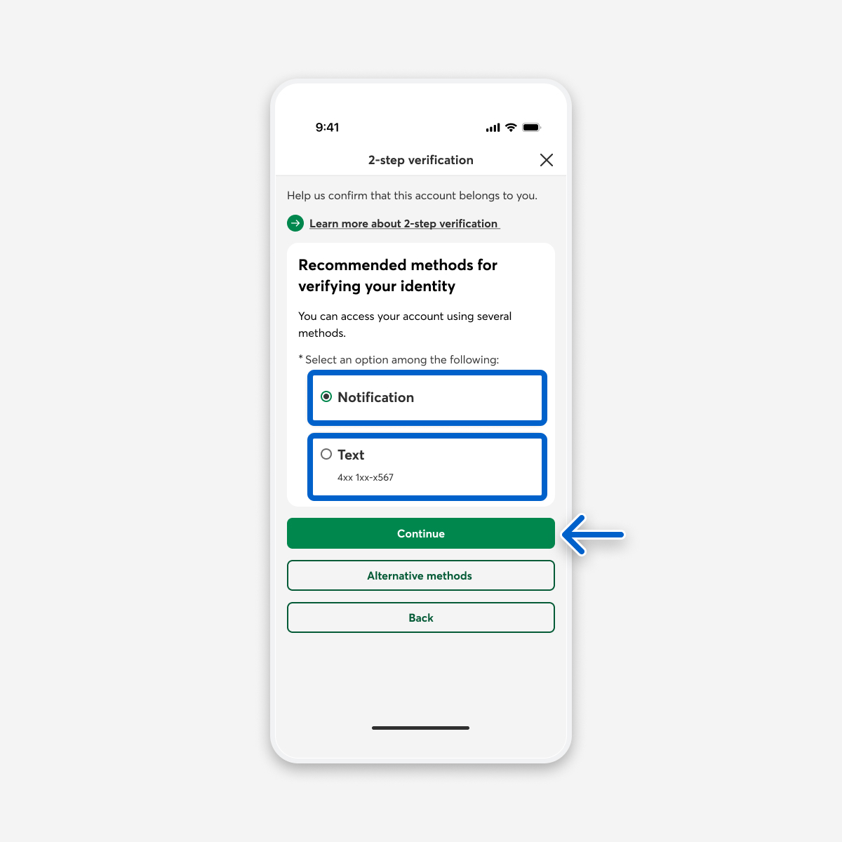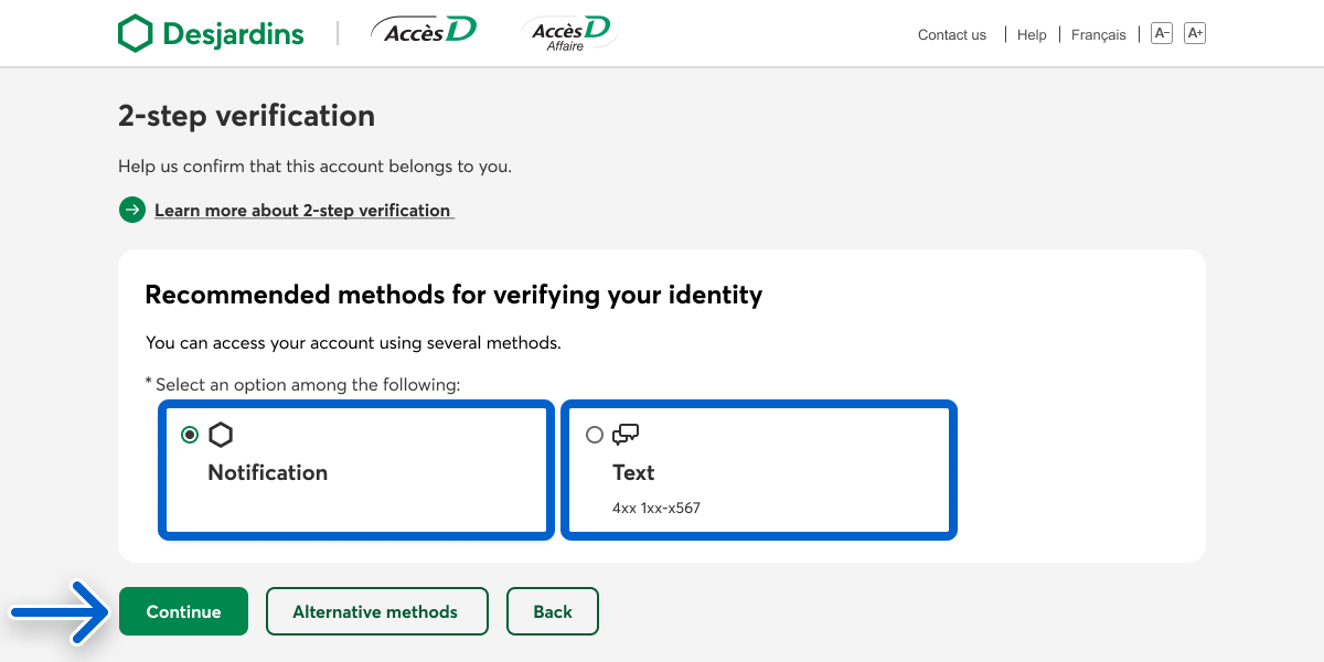 The 2-step verification page appears. Under Recommended methods for verifying your identity, select the Notification or Text button, then select the Continue button. You could also look at alternative methods for verifying your identity.