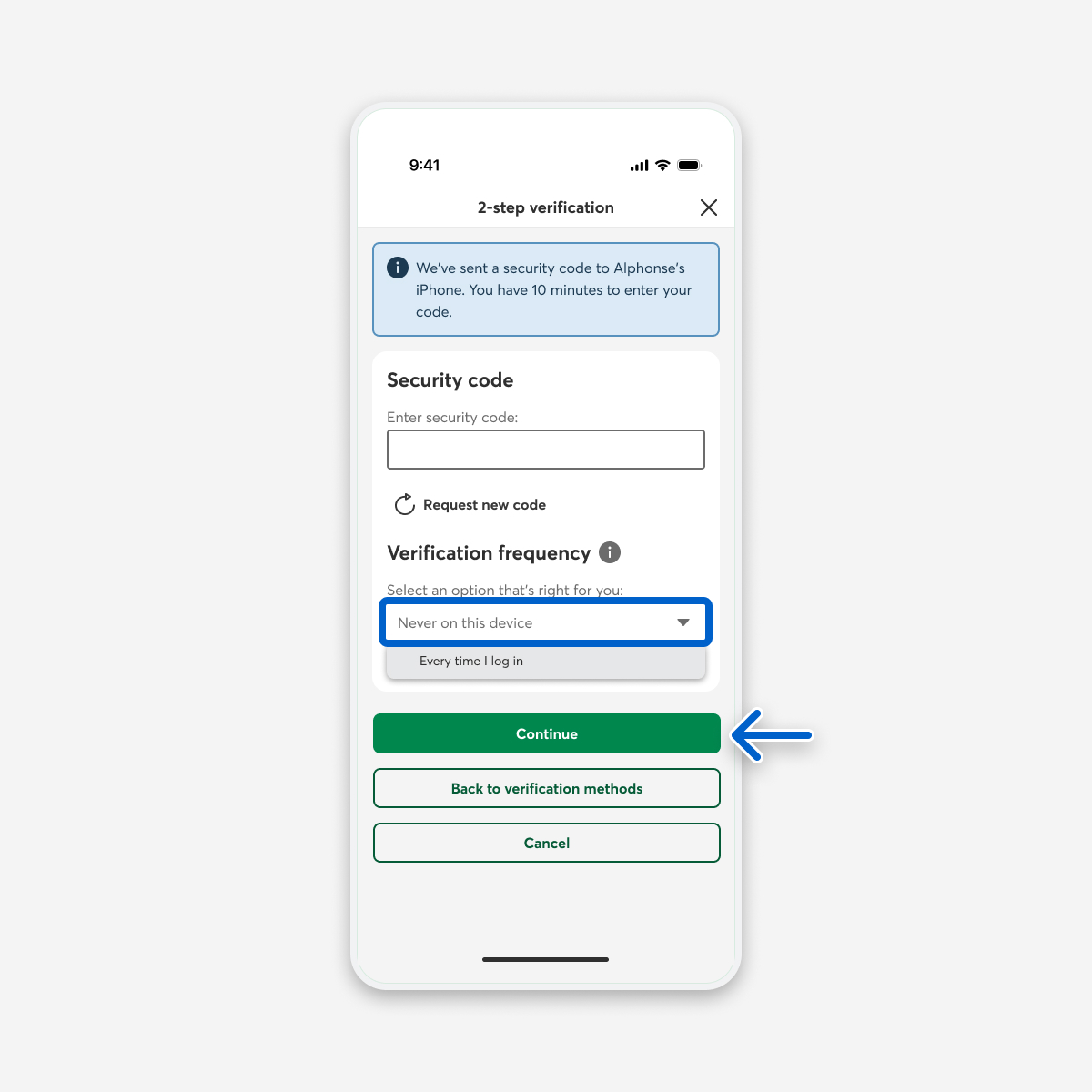 Under Verification frequency, select Never on this browser or Every time I log in from the menu, then select the Continue button.