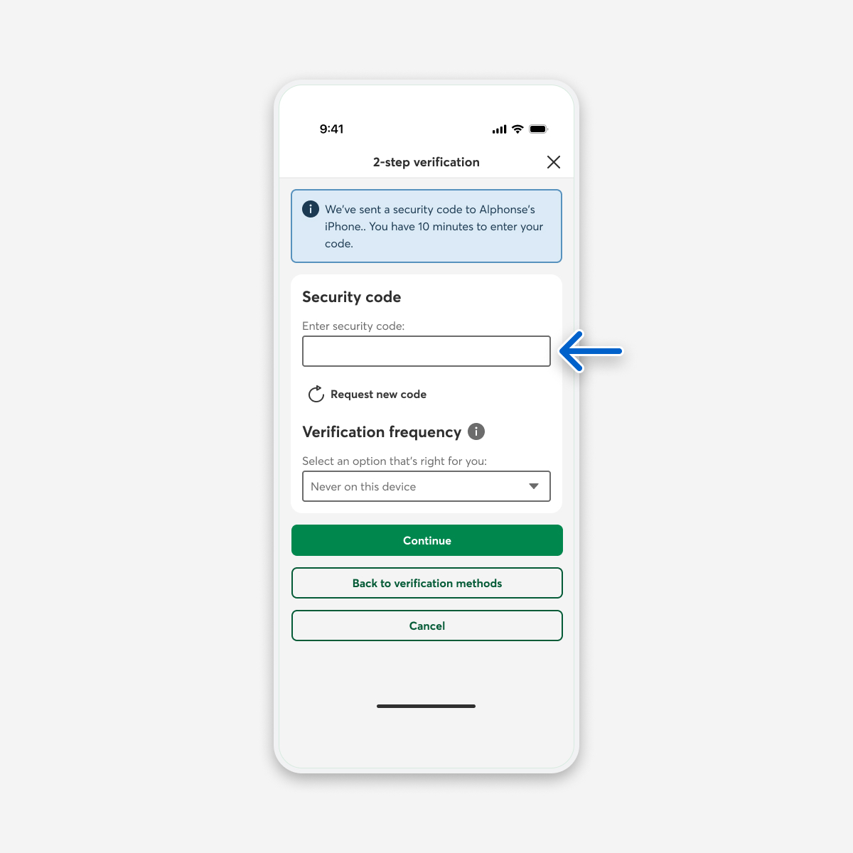 On the 2-step verification page, under Security code, enter the code you received. The code expires after 10 minutes. If you don’t enter it in time, you can request a new one.
