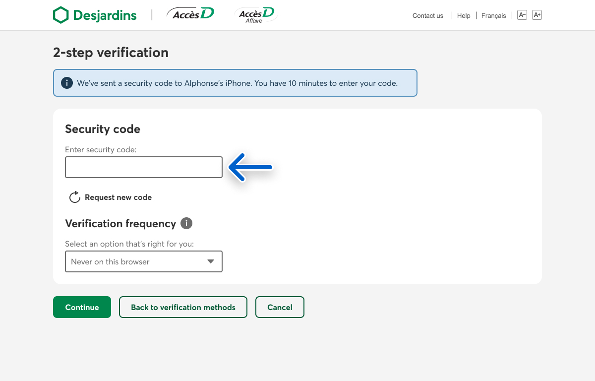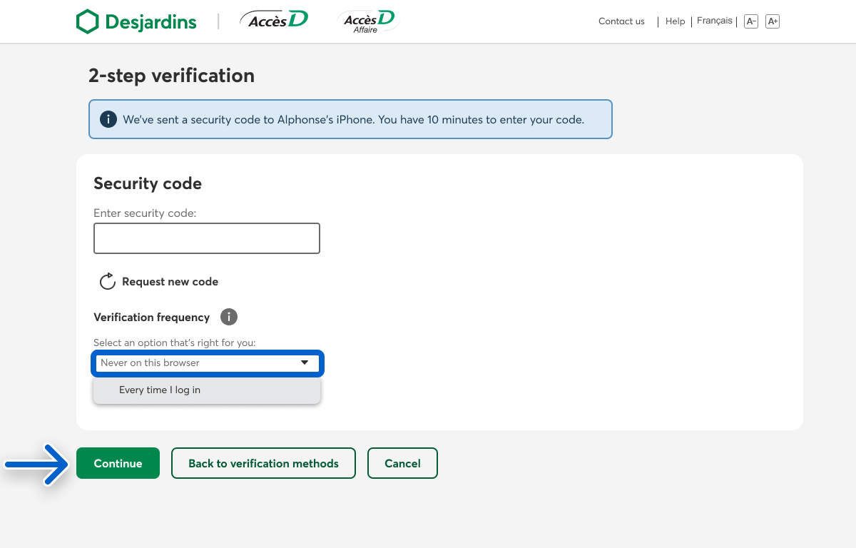 If you try to log in to AccèsD using a different browser or computer, you’ll have to verify your identity again. You might want to change the verification frequency for that browser or computer as well.