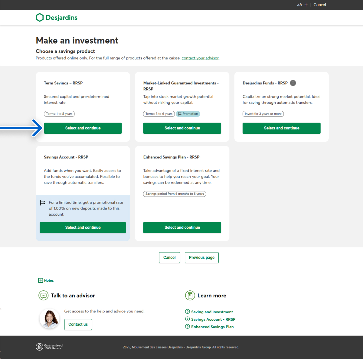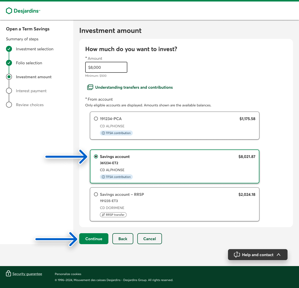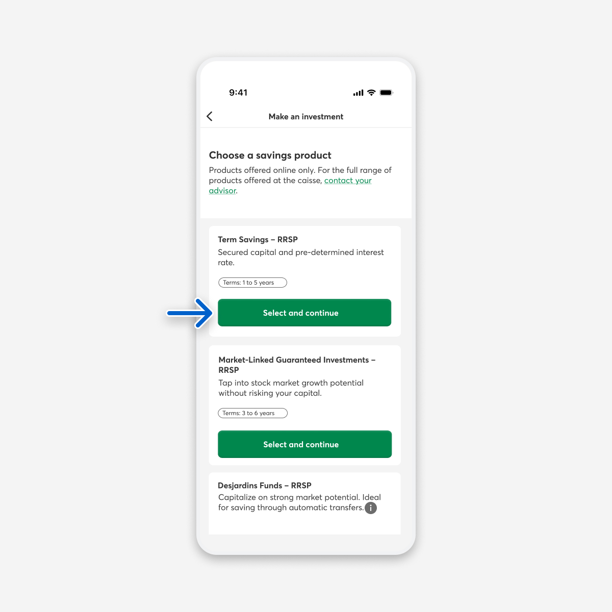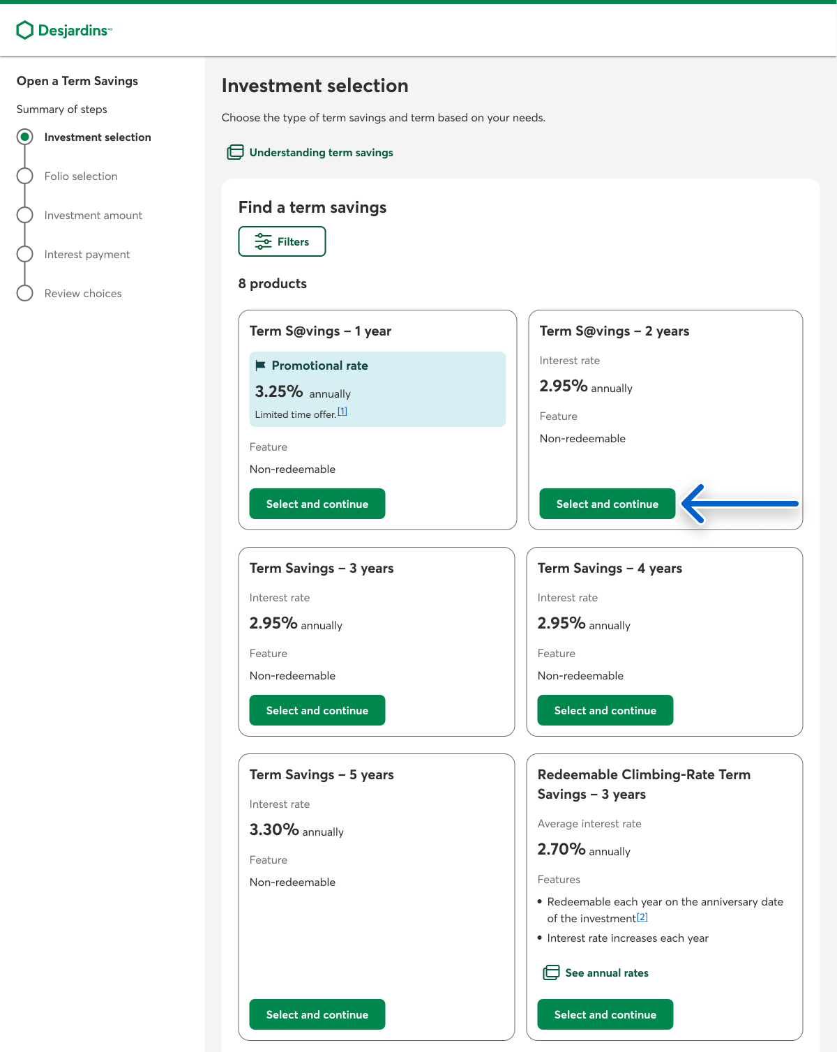 In the Investment selection step, choose the Select and continue button for the term savings product you want.