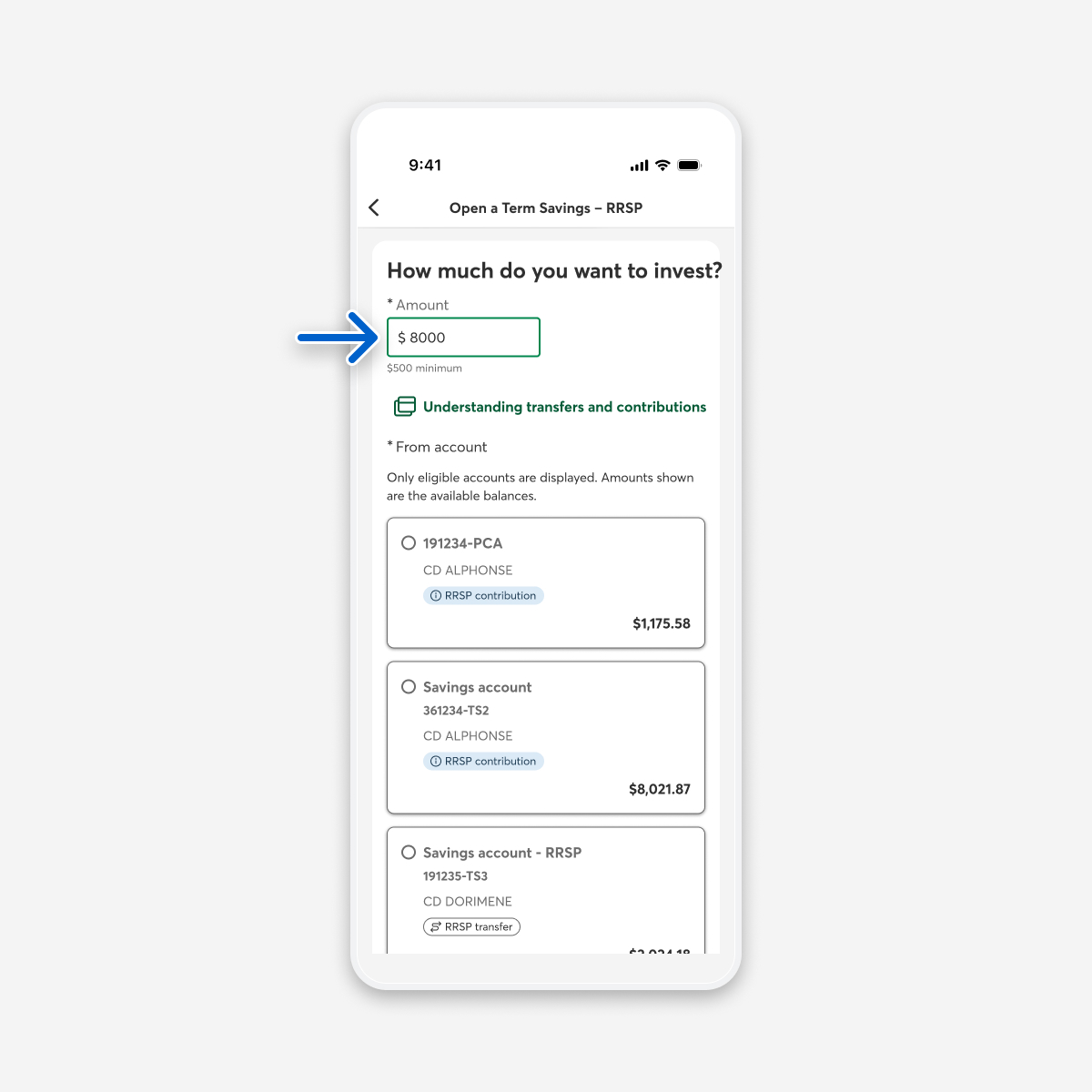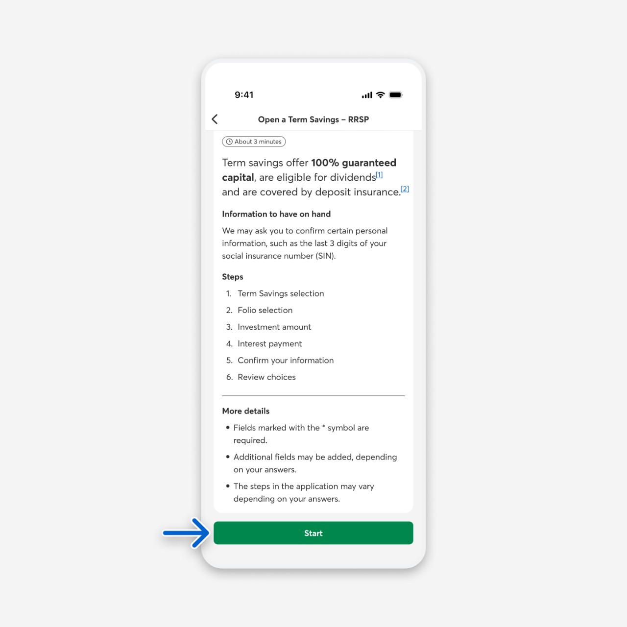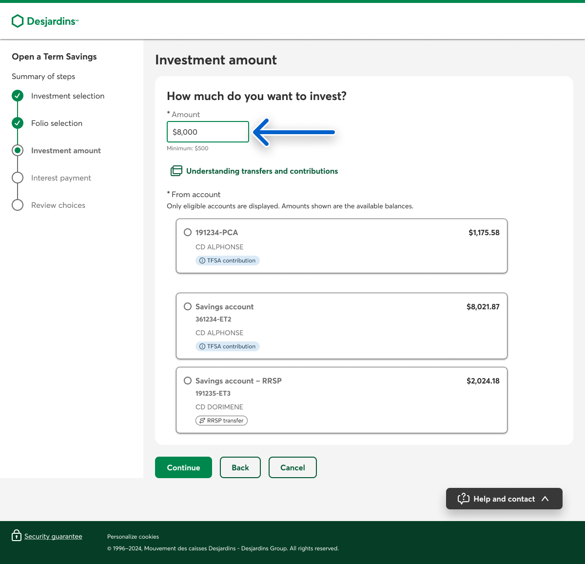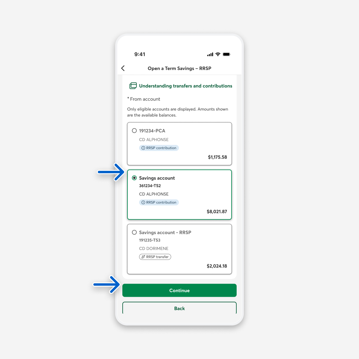 In the Investment selection step, choose the Select and continue button for the term savings product you want.