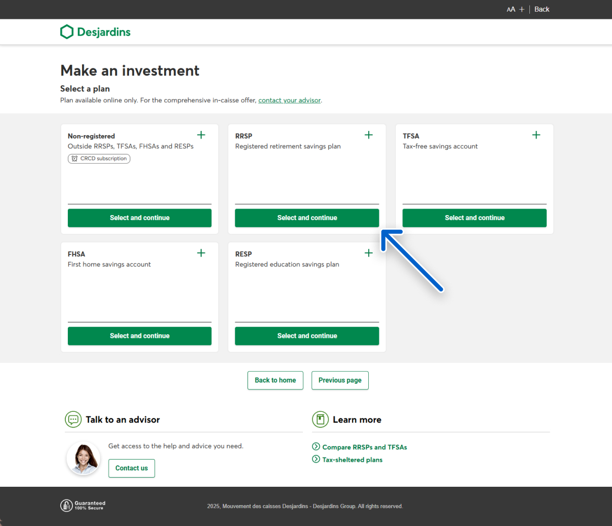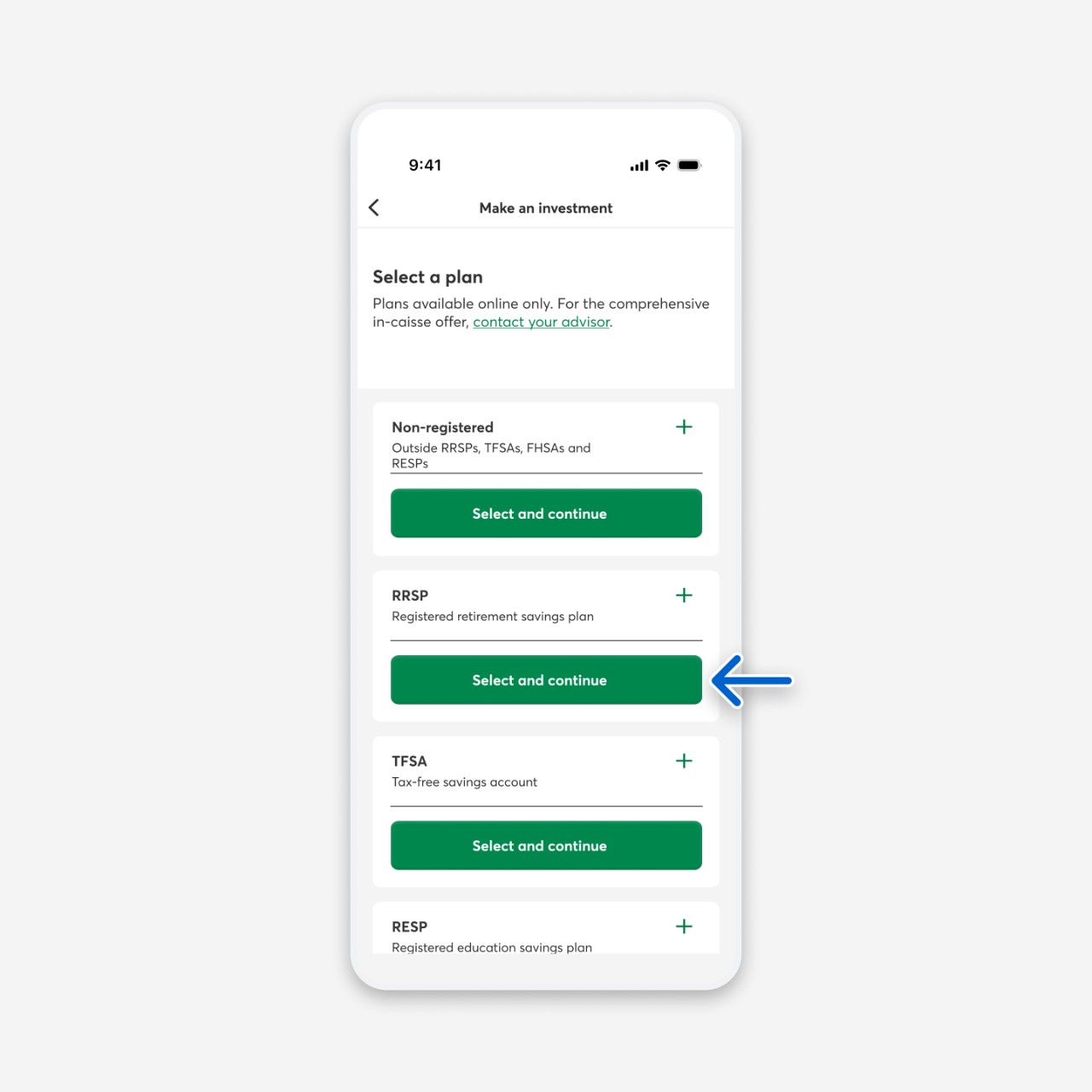 The Make an investment page opens. Under Select a plan, choose the Select and continue button for the type of plan you want.
