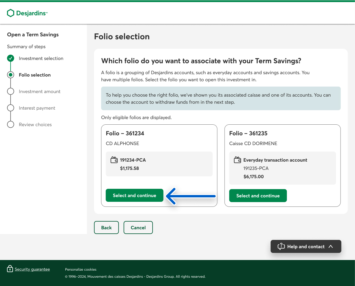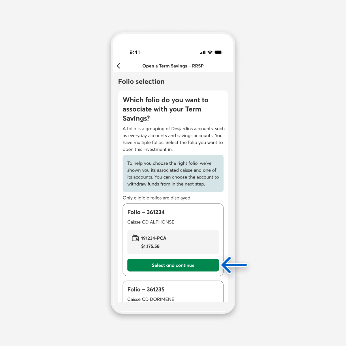 In the Folio selection step, choose the Select and continue button for the folio you want to use to open the investment. If you only have one folio, select the Continue button.
