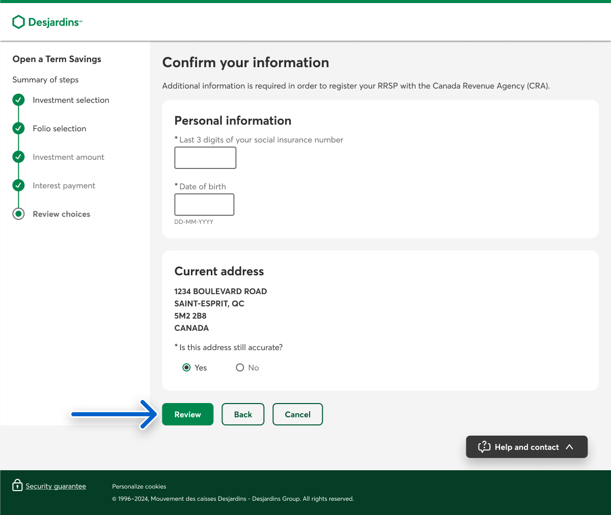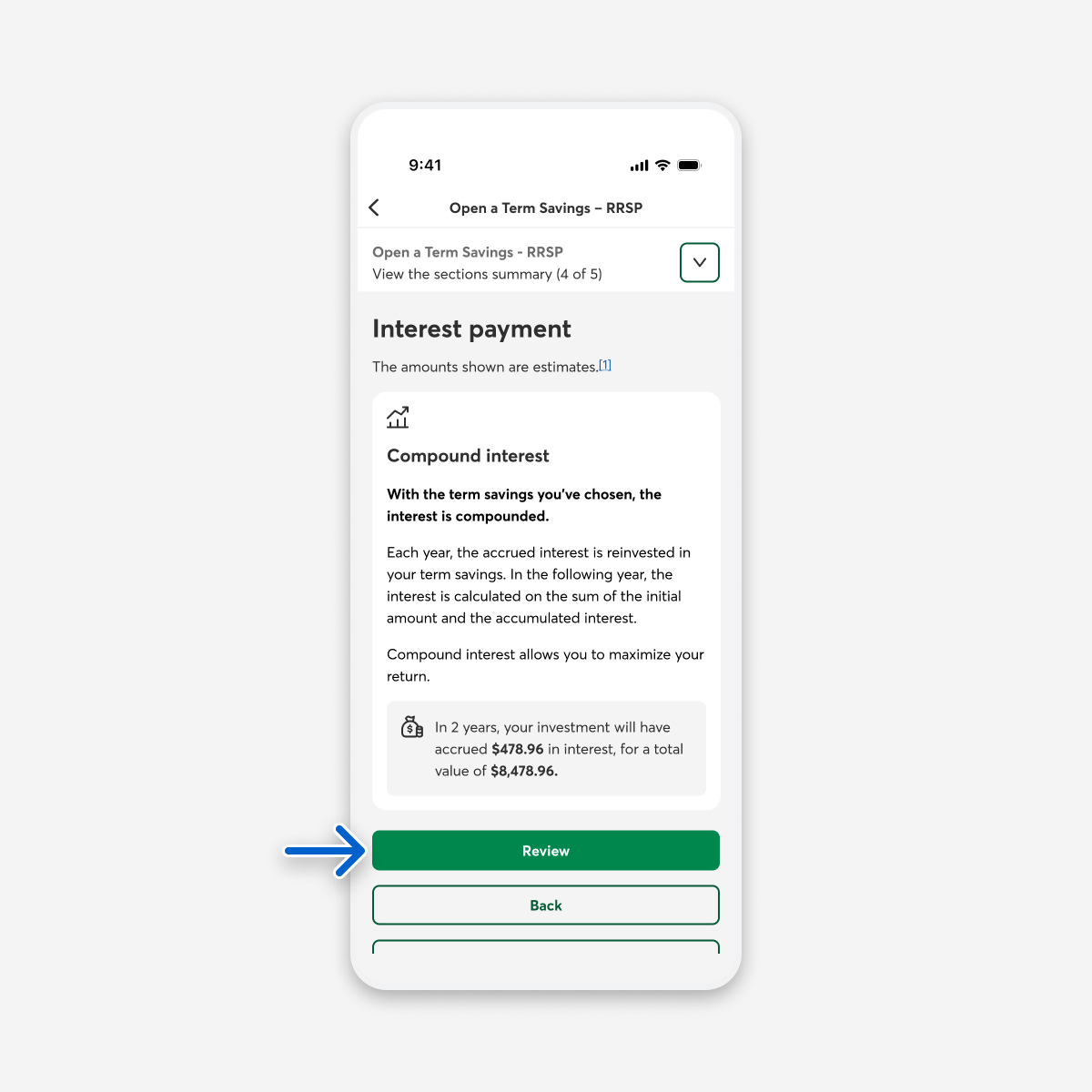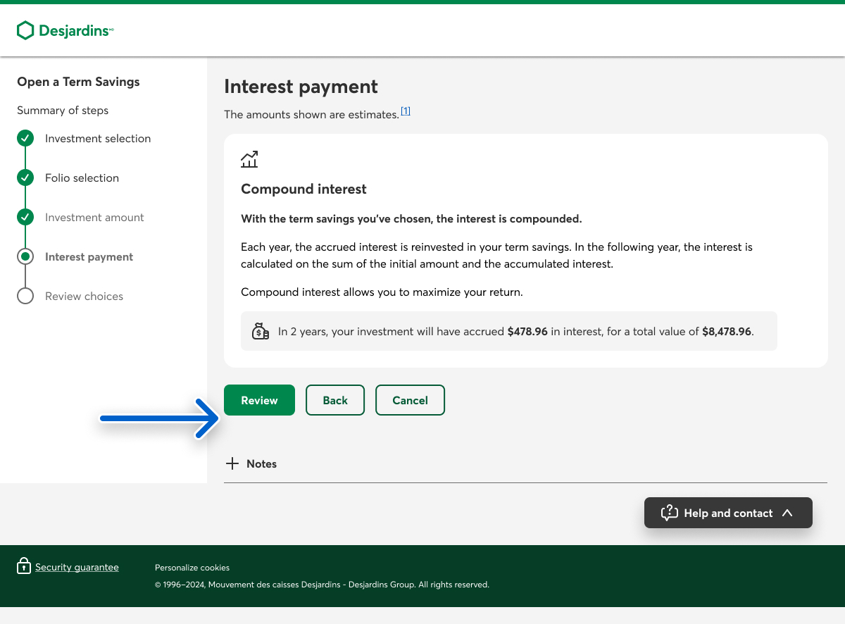 In the Interest payment step, select the Review button. If you chose a non-registered plan, select the type of interest you want and, if applicable, the account where you want to deposit the interest.