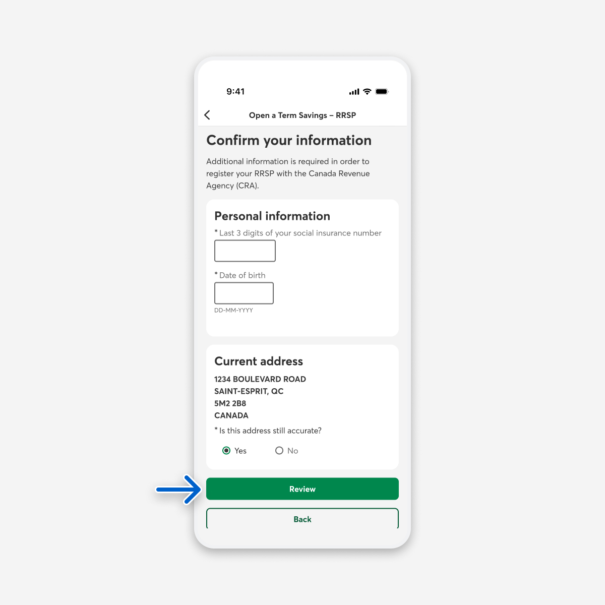 If you need to register your plan with the Canada Revenue Agency (CRA), in the Confirm your information step, complete the Personal information and Current address sections, then select the Review button.