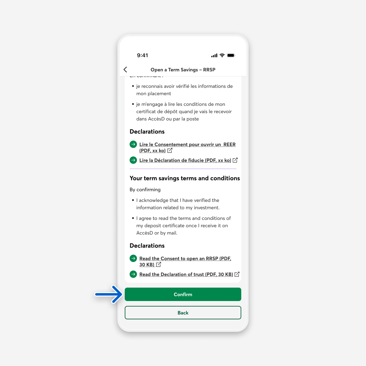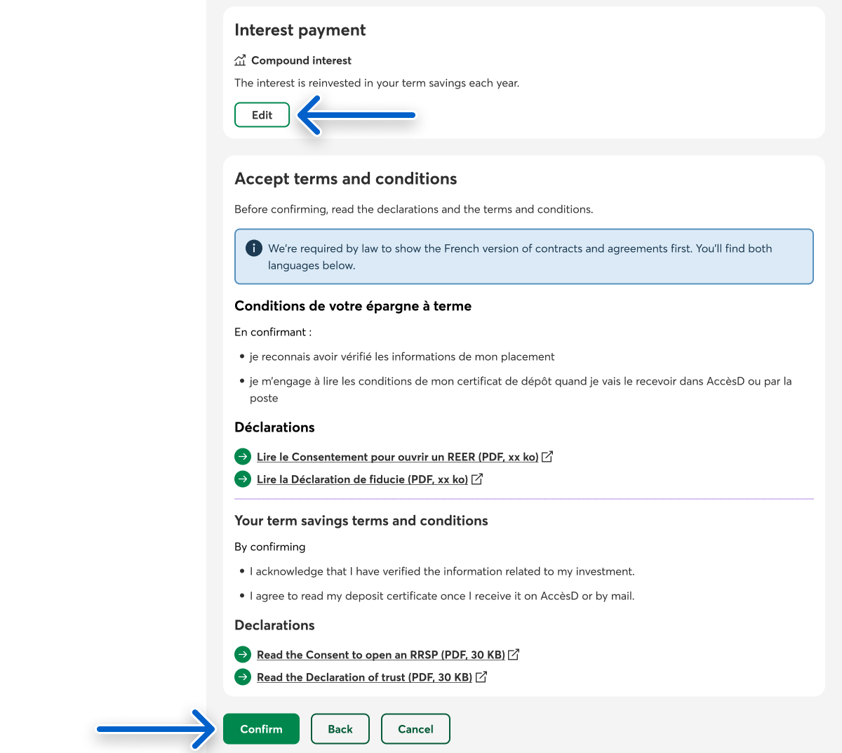 In the Review choices step, make sure the information you entered is accurate, then select the Confirm button to purchase your term savings investment. To change something, select the Edit button.