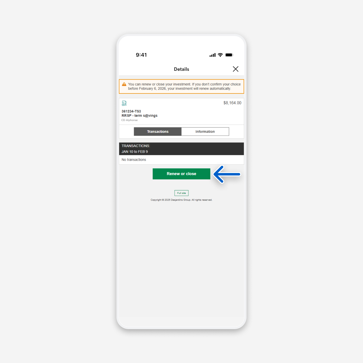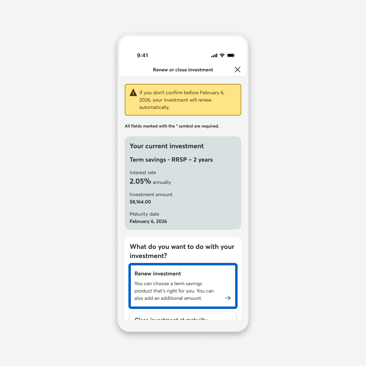 If your investment can be renewed online, you can renew it in the weeks leading up to the maturity date. A reminder will appear in your list of savings and investment accounts to let you know that it will be maturing soon.