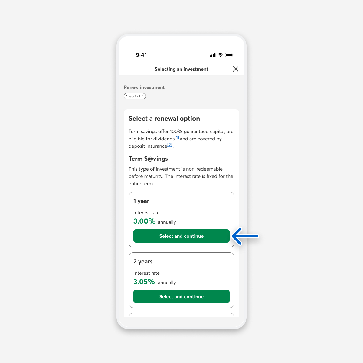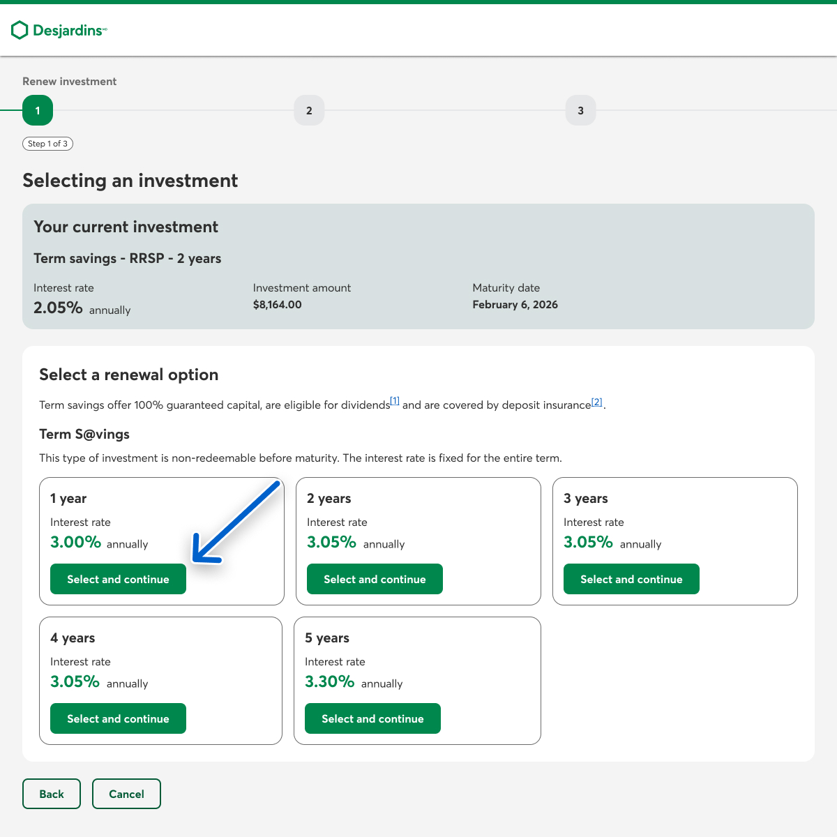 The Renew investment page opens. In the Selecting an investment step, find the renewal option you want, then select the Select and continue button for that option.