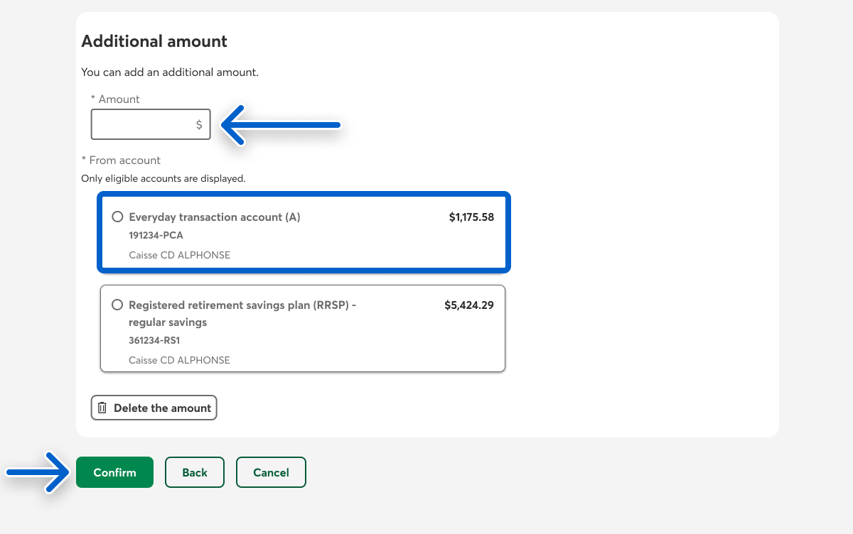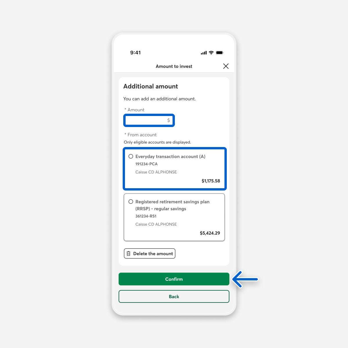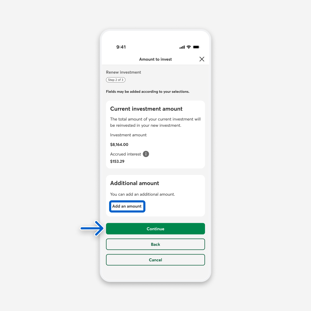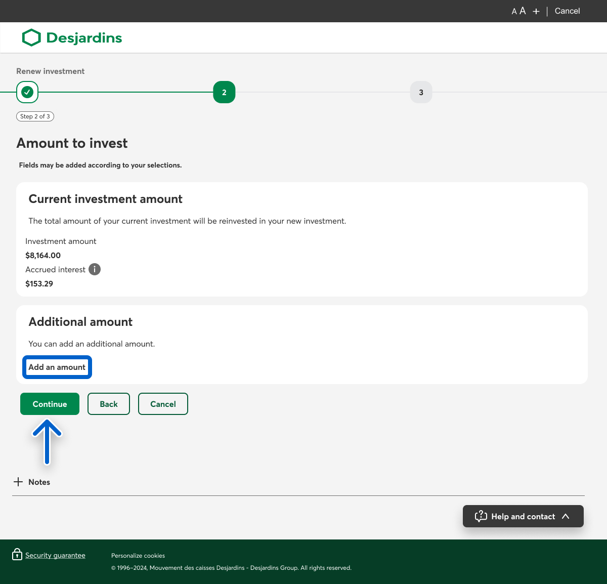 In the Amount to invest step, if you want to add to your current amount, select the Add an amount button, then select the Continue button. Otherwise, select the Confirm or Continue button and go to step 8.