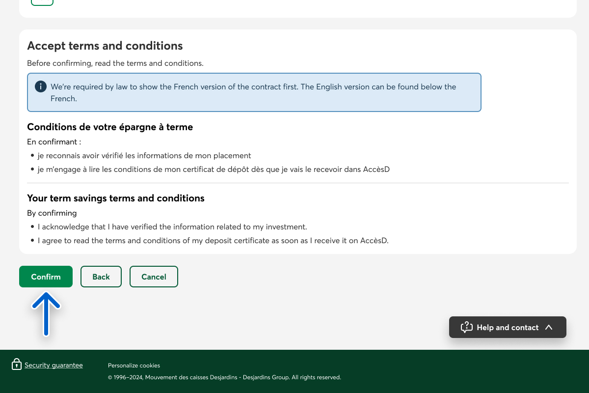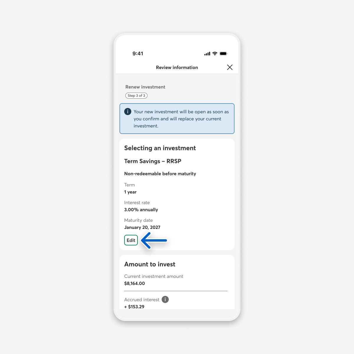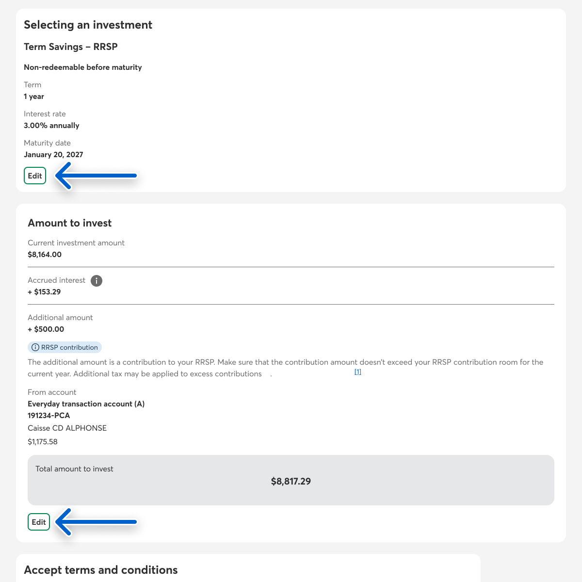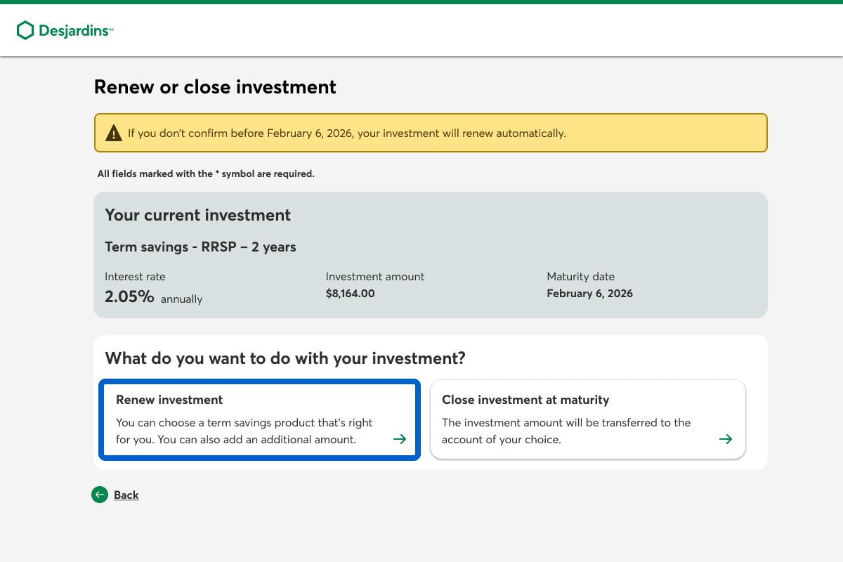 If you’re renewing an investment in a non-registered account, you need to confirm whether you want to keep depositing interest into the preselected account or into another account.