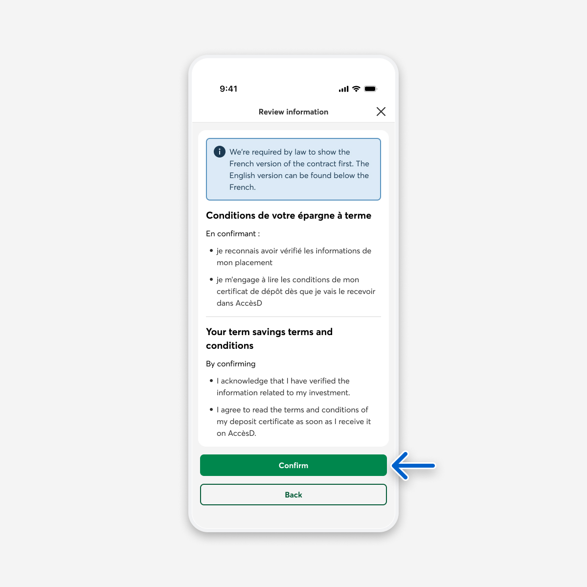 Select the Confirm button to renew your term savings investment.