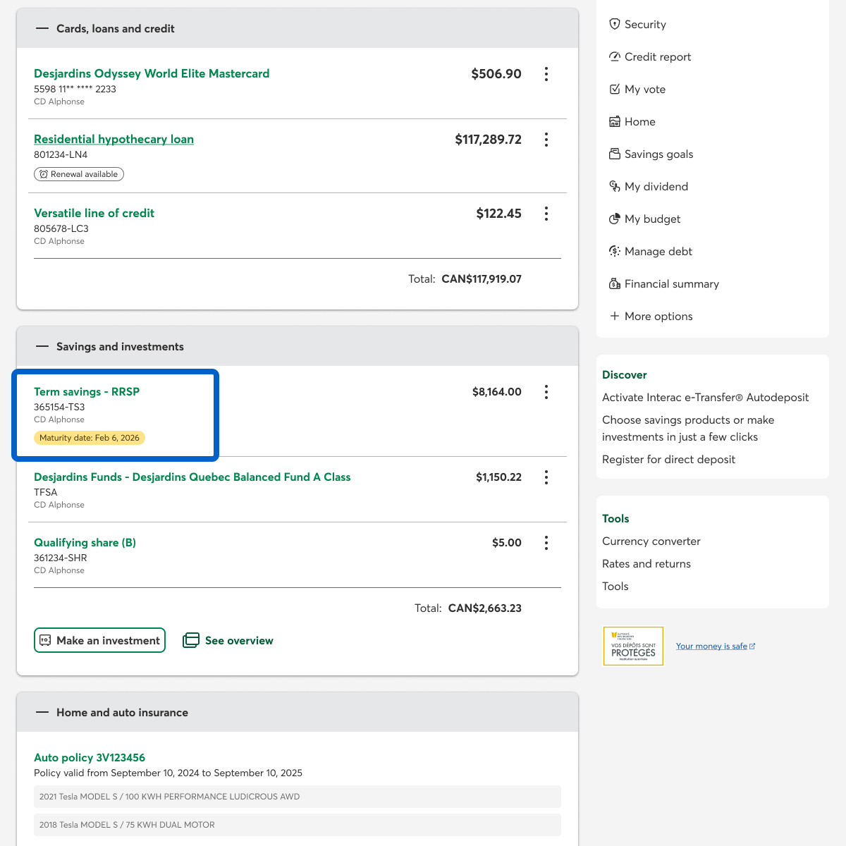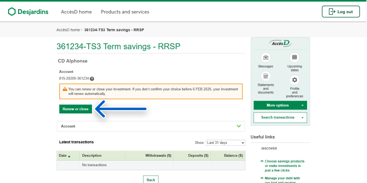 On the AccèsD home page, under Savings and investments, select the term savings you want to renew.