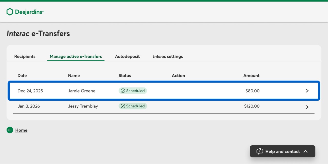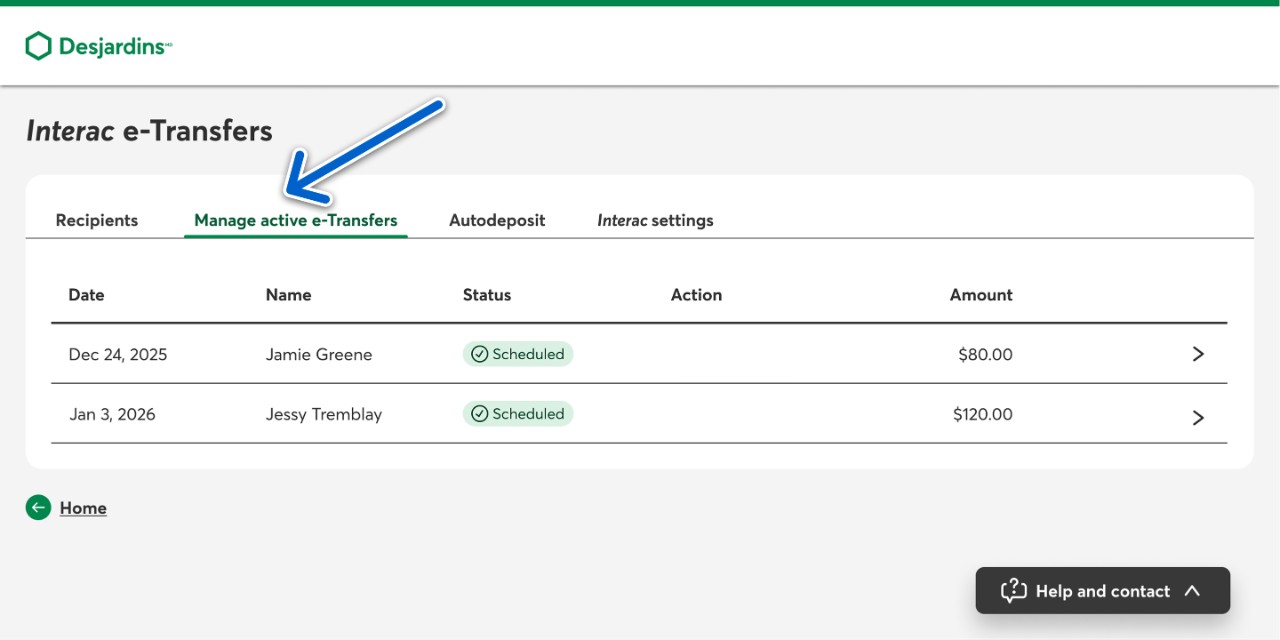 On the Interac e-Transfers page, select the Manage active e-Transfers tab.