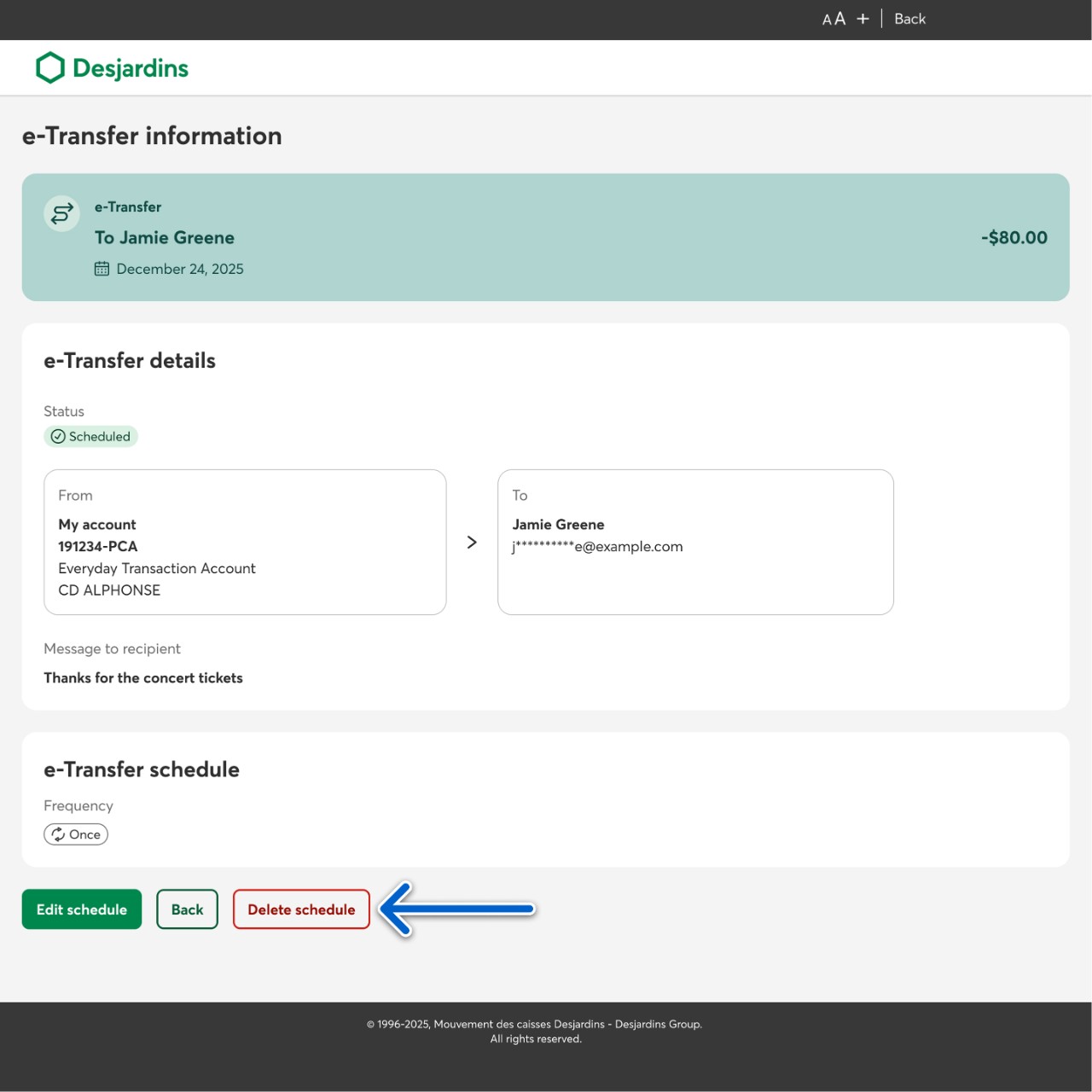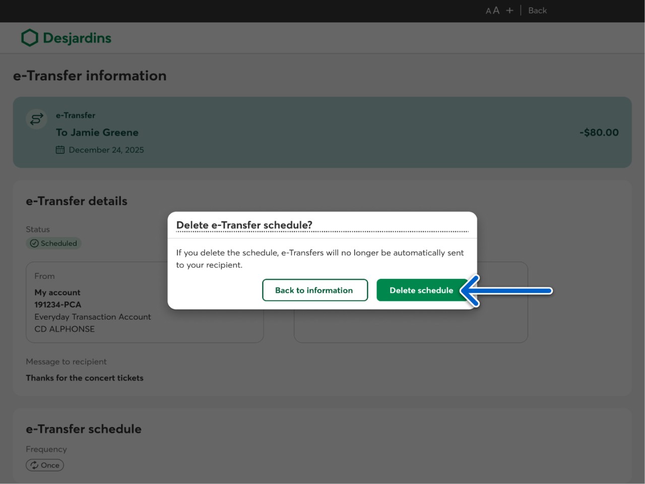 Learn how to delete a scheduled Interac e-Transfer® on AccèsD. This feature is not yet available in our mobile app.