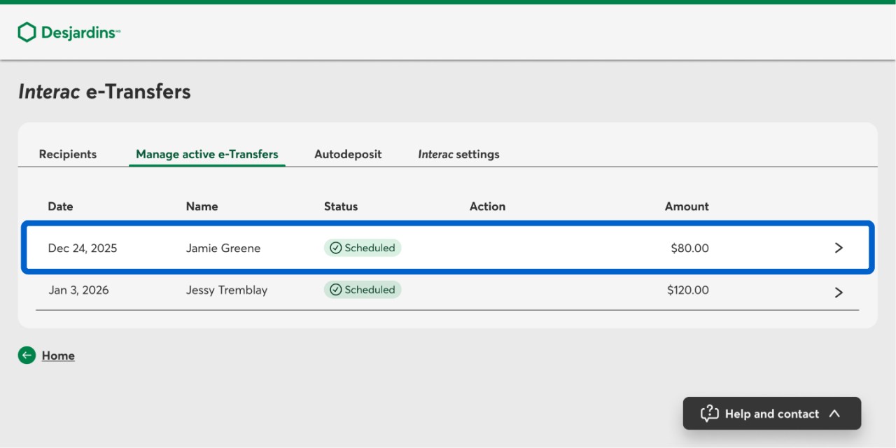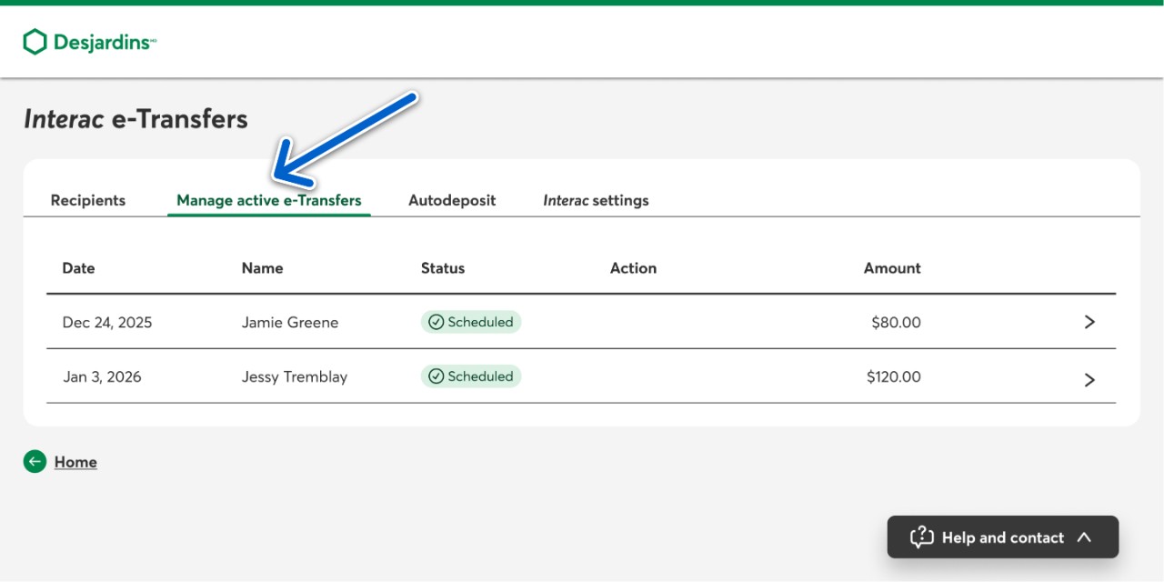 On the Interac e-Transfers page, select the Manage active e-Transfers tab.