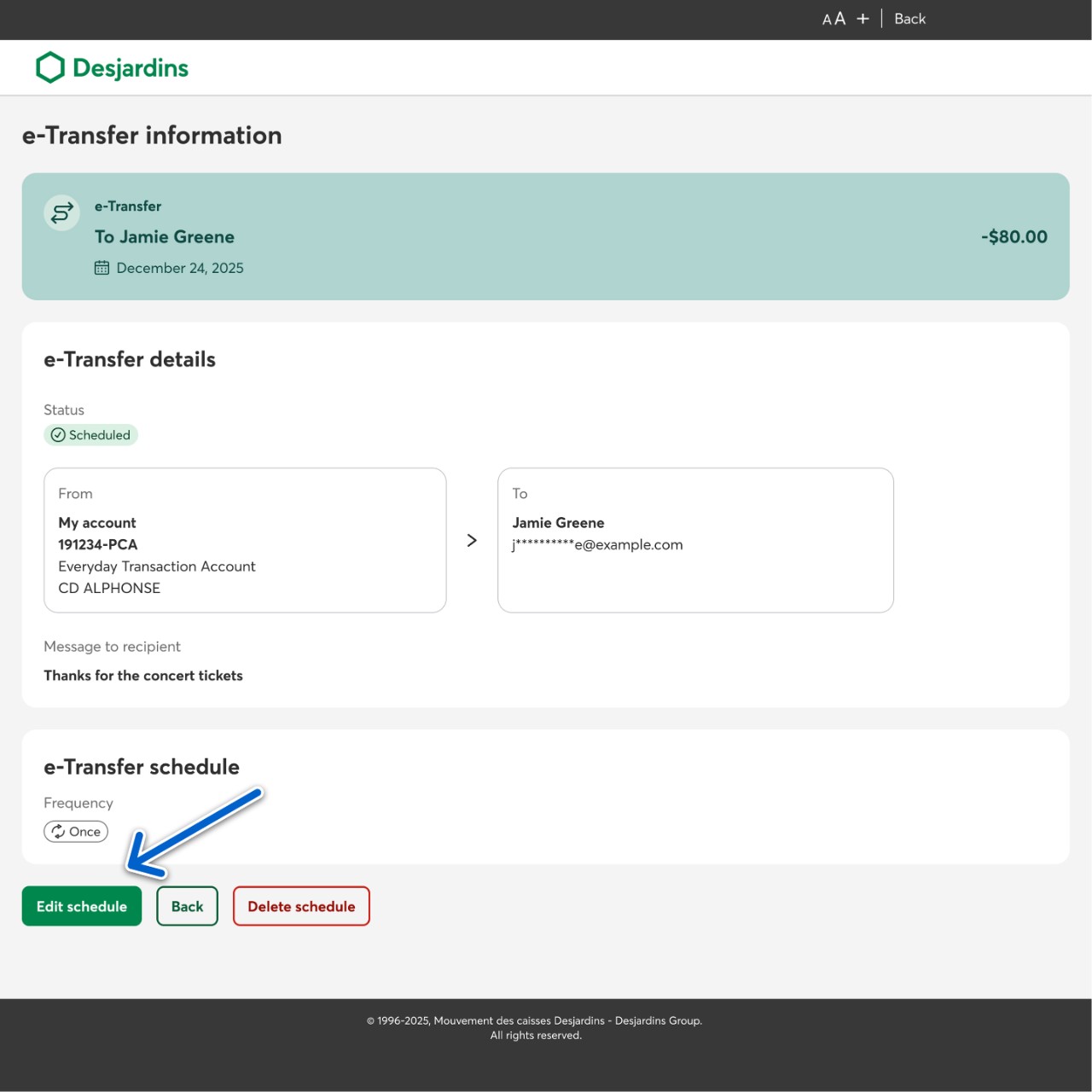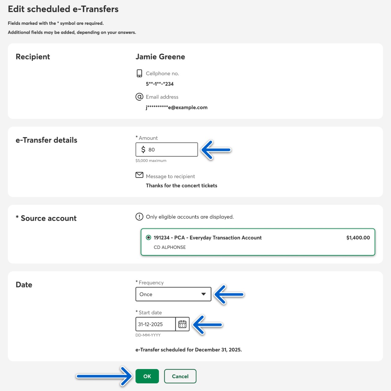On the Edit scheduled e-Transfers page, edit the information you’d like to change. Then select the OK button.