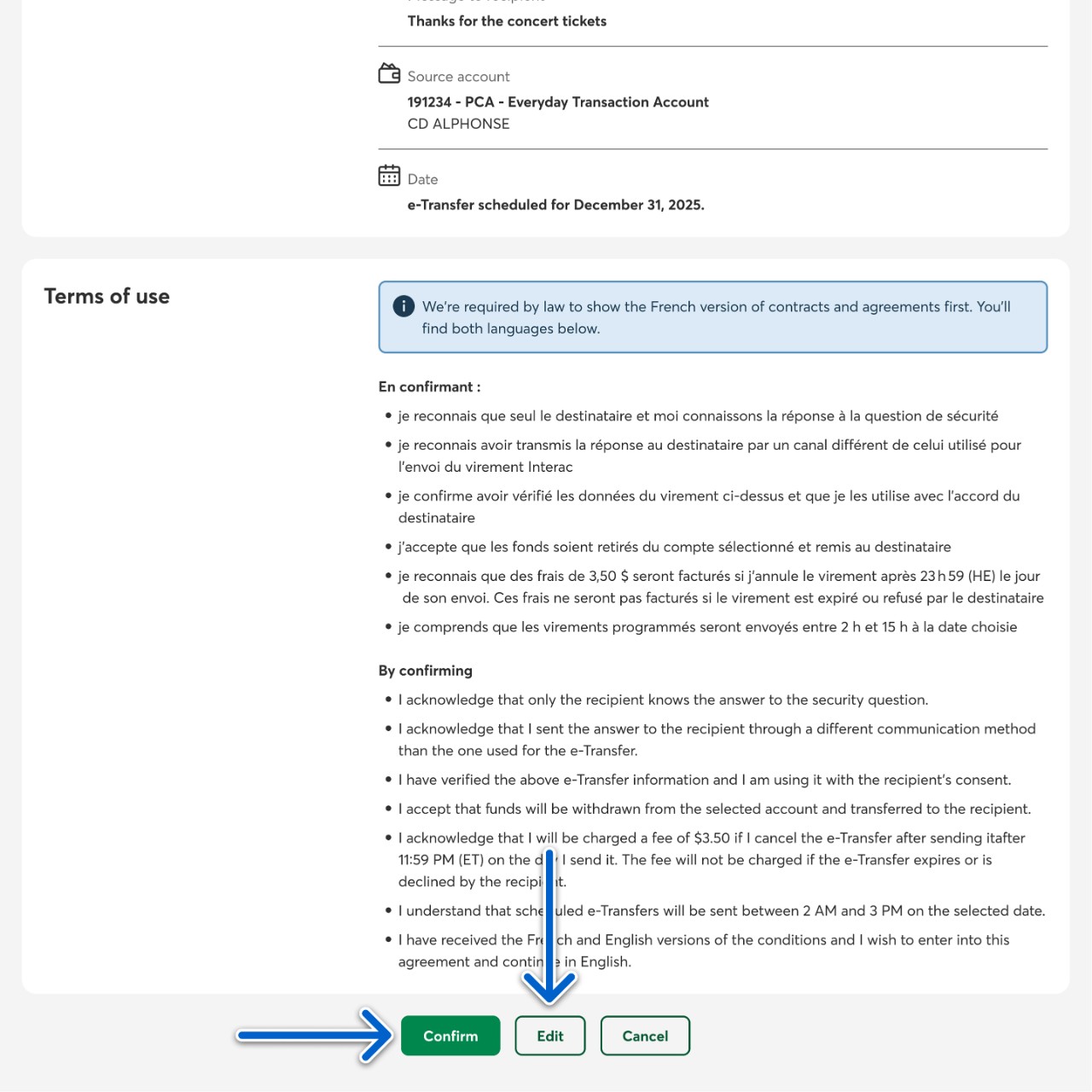 At the validation step, make sure your scheduled e-transfer’s information is correct, then select the Confirm button to apply the changes. Select the Edit button if you wish to make more changes.