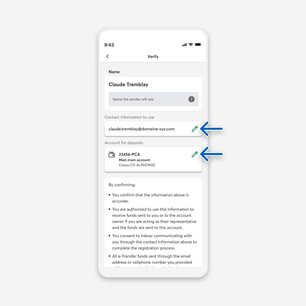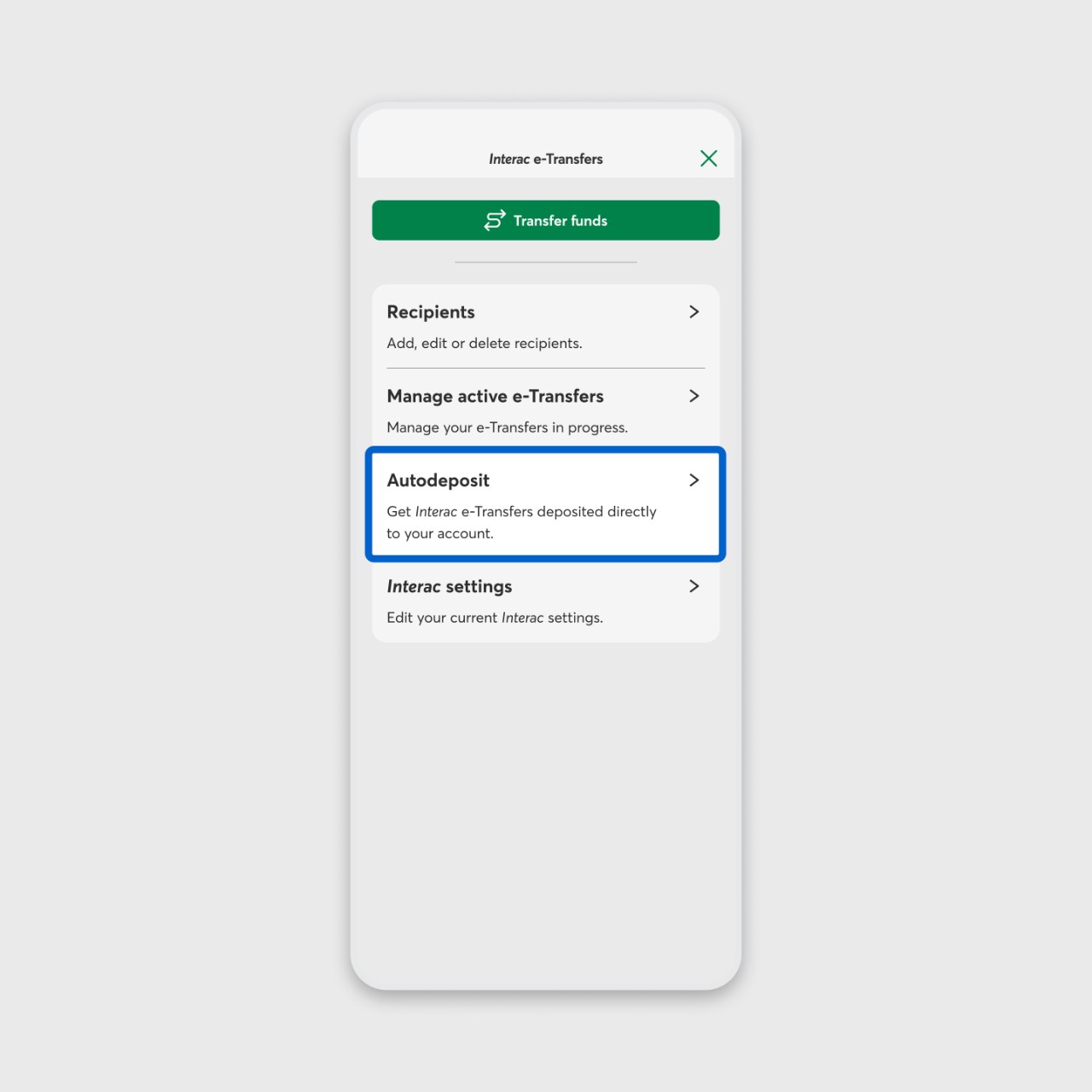 On AccèsD, use your mobile device or computer to request that the money you receive through Interac e-Transfer® be automatically deposited into your account.