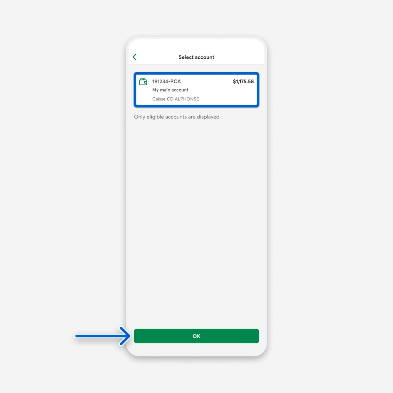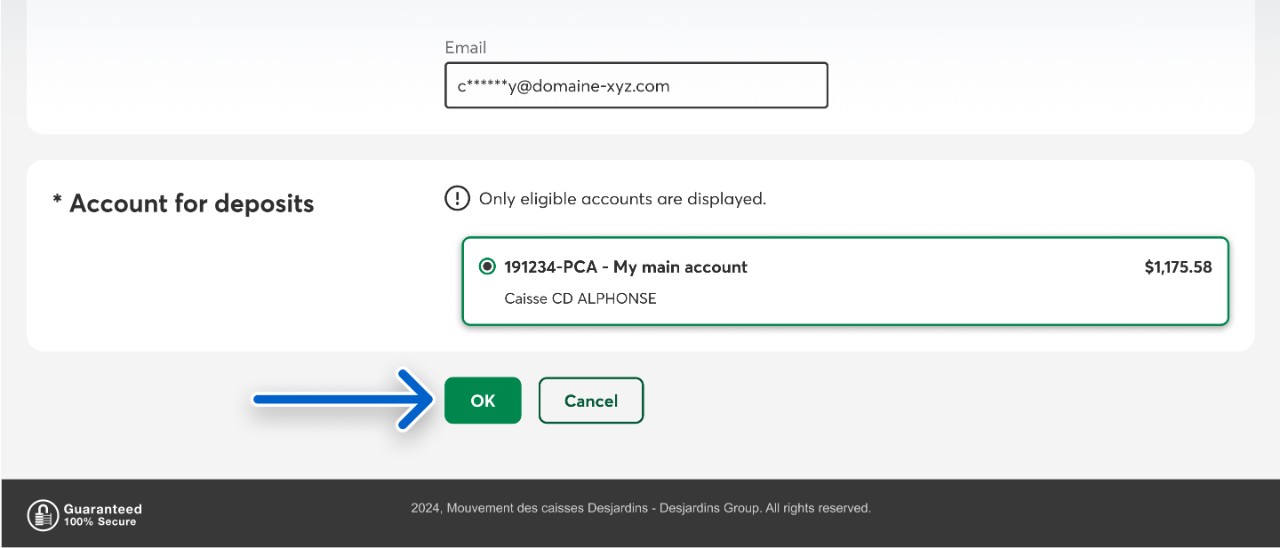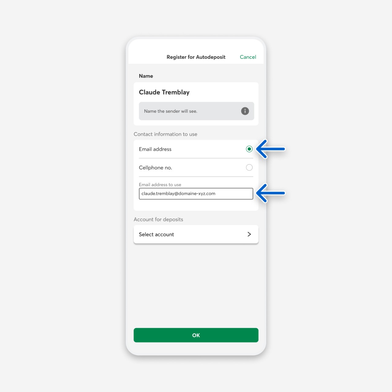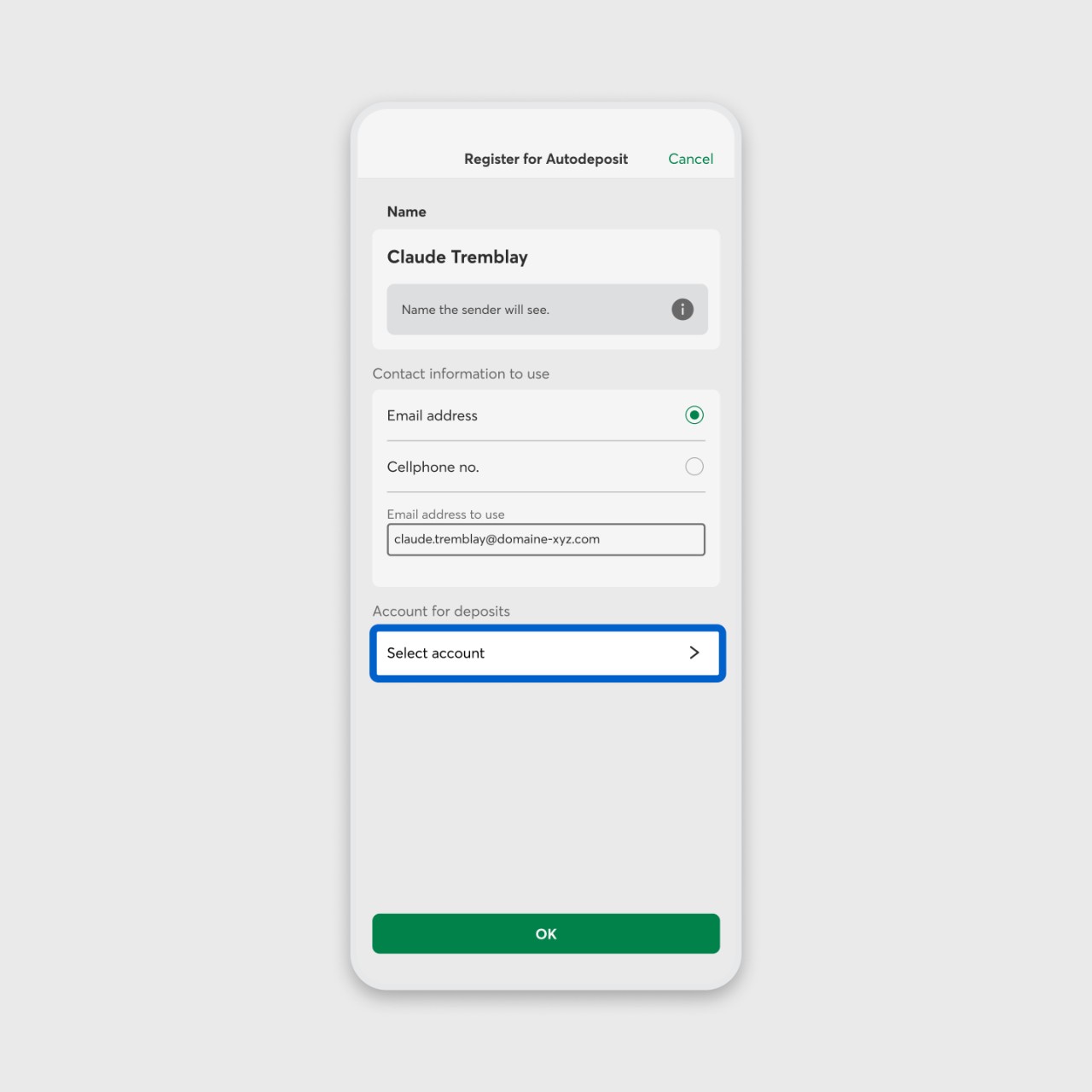 Choose the account where you want your Interac e-Transfers deposited and then, OK.