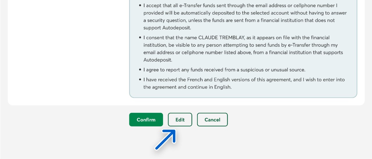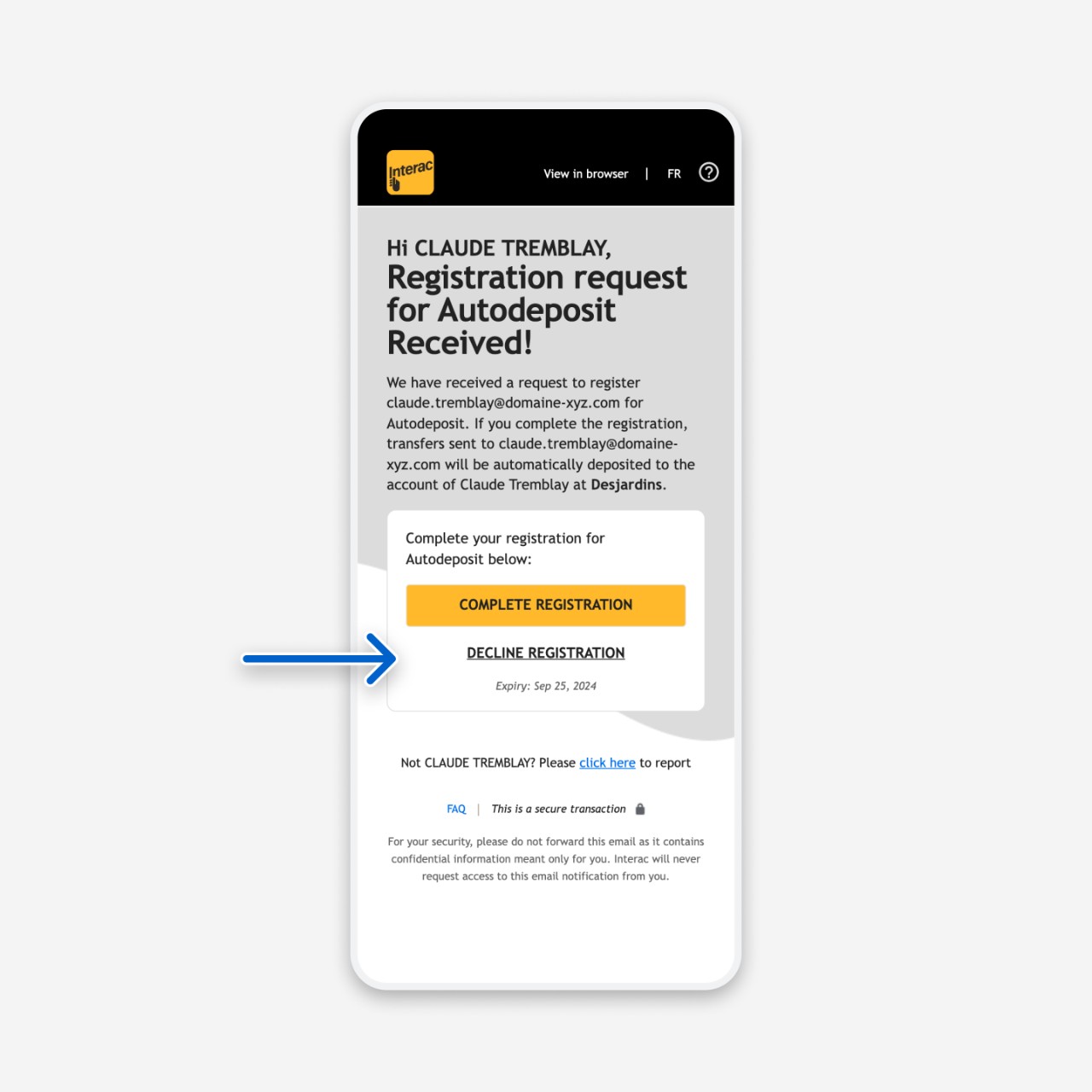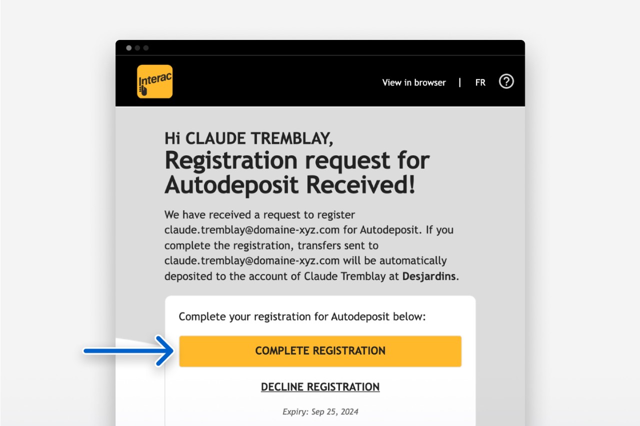 Select the link you receive by email or text from Interac, then select Complete registration.