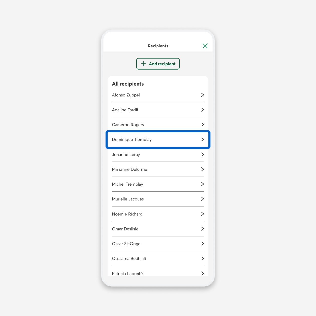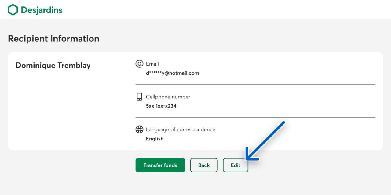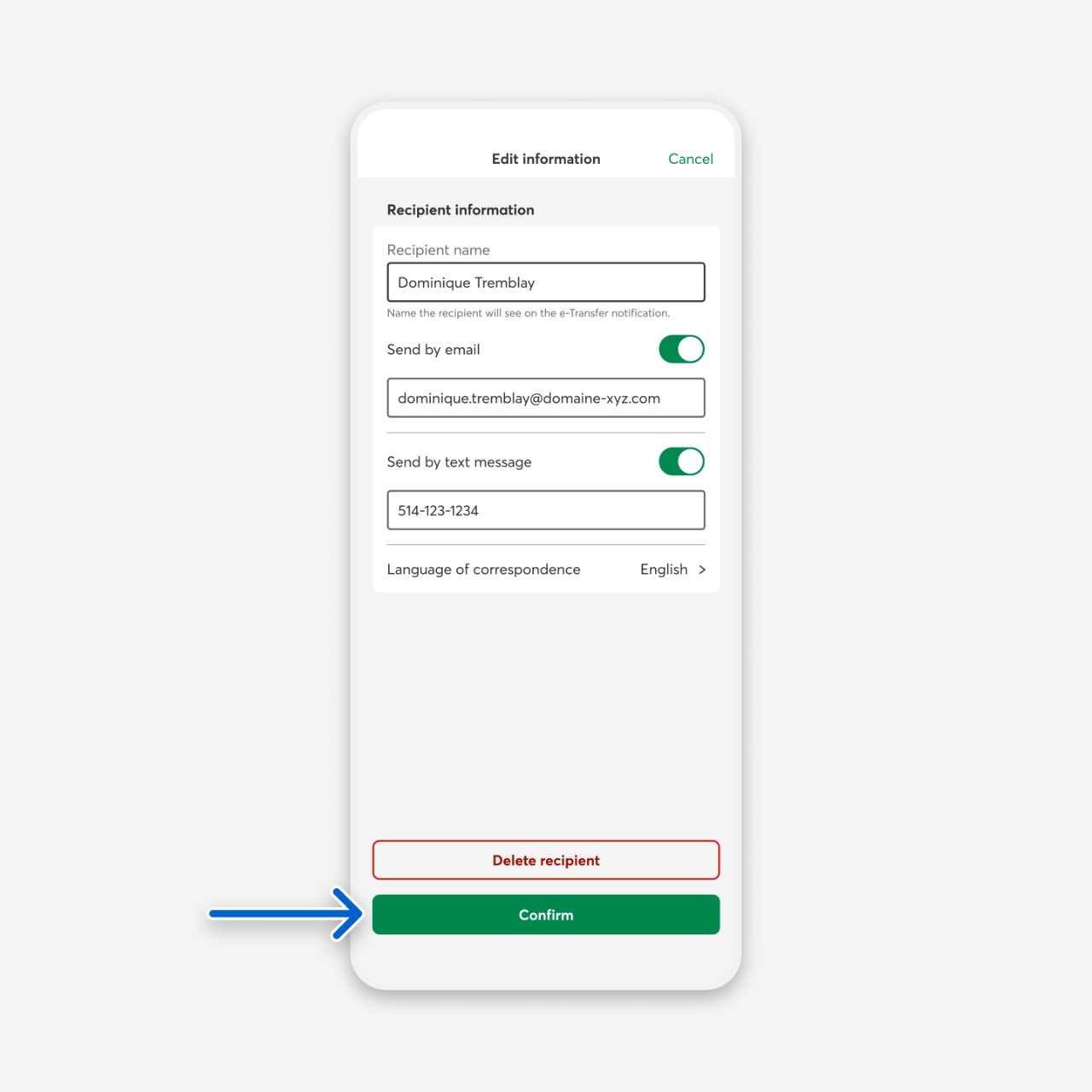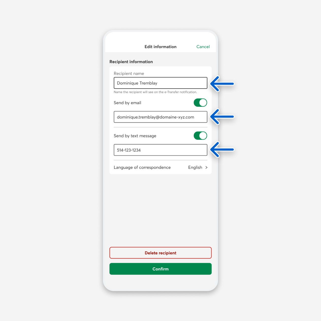 Edit the contact information of your Interac e-Transfer® recipients on AccèsD from a mobile device or computer.